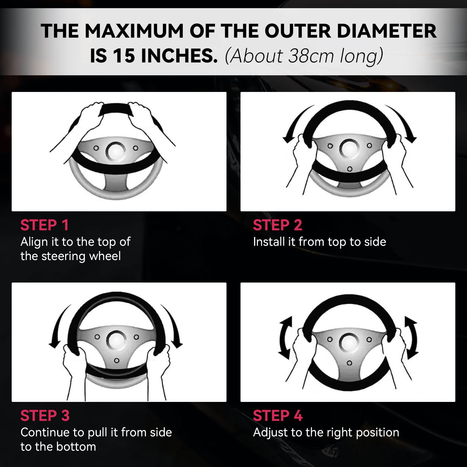 Easy to Install: Just 2-3 minutes! Firstly, align it to the top of the auto-steering wheel. Then install the steering wheel cover from top to side and continue to pull it from side to the bottom. Finally, adjust to the right position. (Note: It is recommended to soften it with a hairdryer or put it in the sun for a few minutes before installation.)