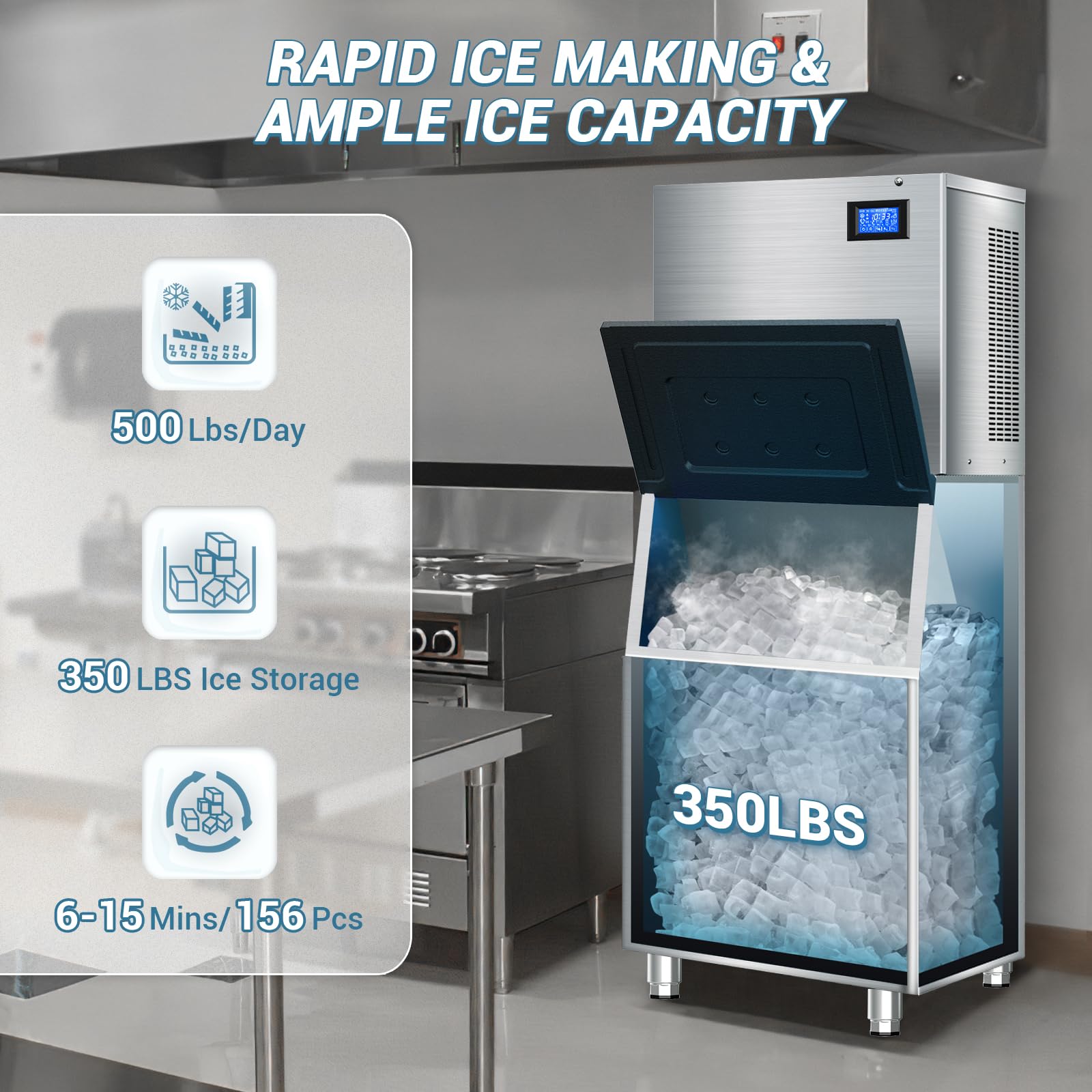 High Ice Production & Storage Capacity : Experience exceptional performance with our commercial ice machine, producing 500 lbs of ice every 24 hours. Its generous 350 lbs storage bucket ensures you’ll never run out of ice, meeting all your business needs effortlessly.