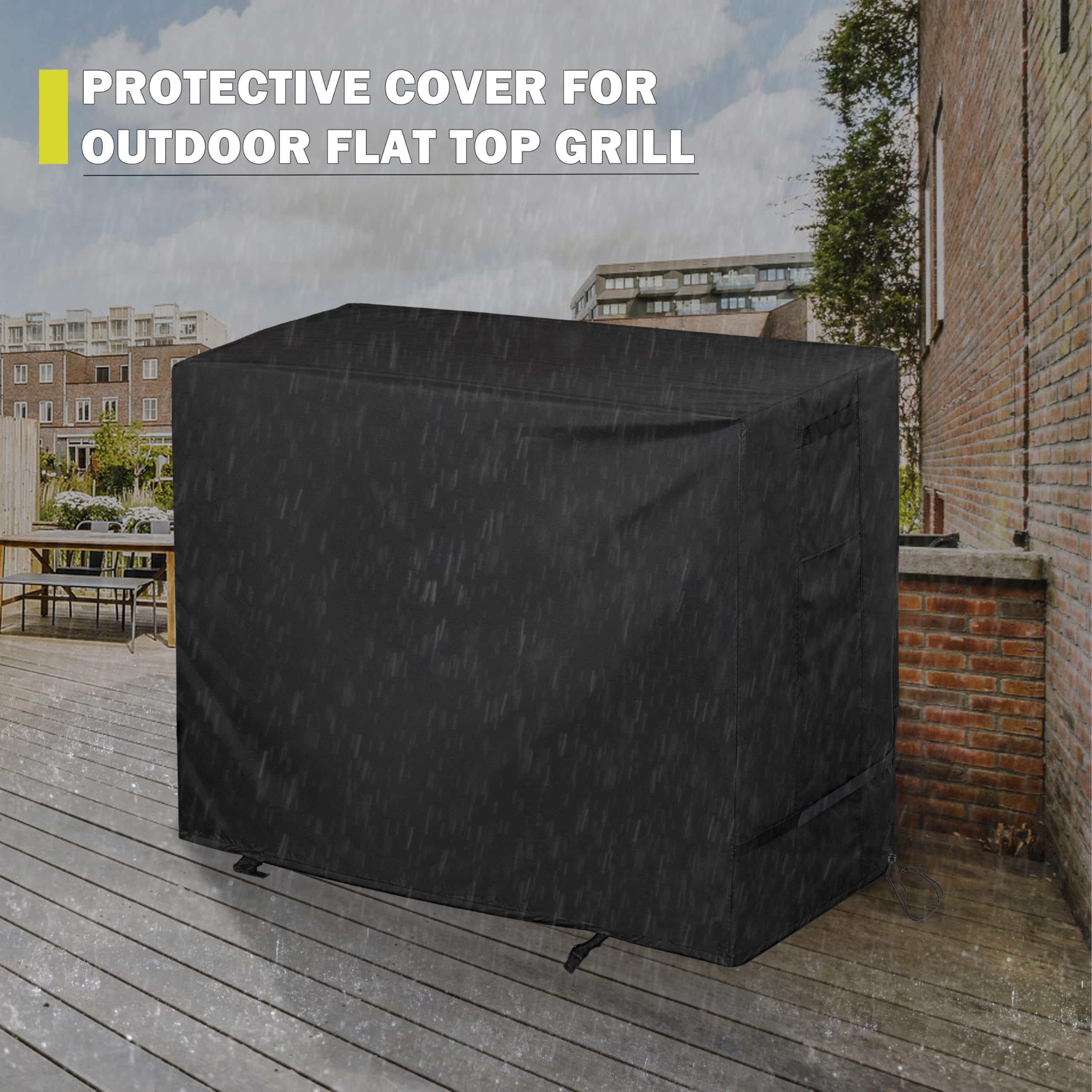 FIT & SECURE – Drawstring and click close-straps allow you to easily adjust the flat grill cover for a tight and custom-like fit. Four buckles can keep the cover in place and prevent the cover from being blown off on windy days