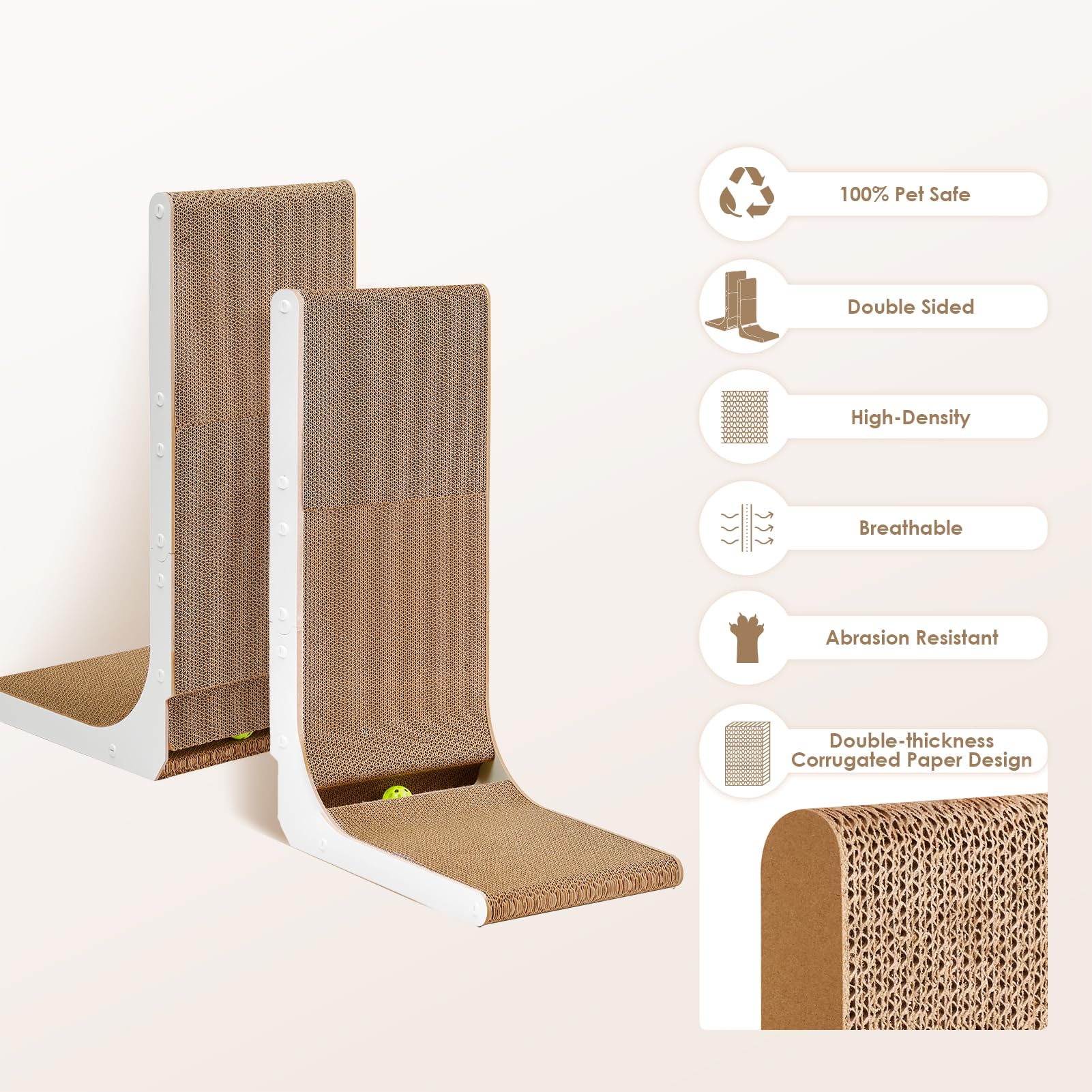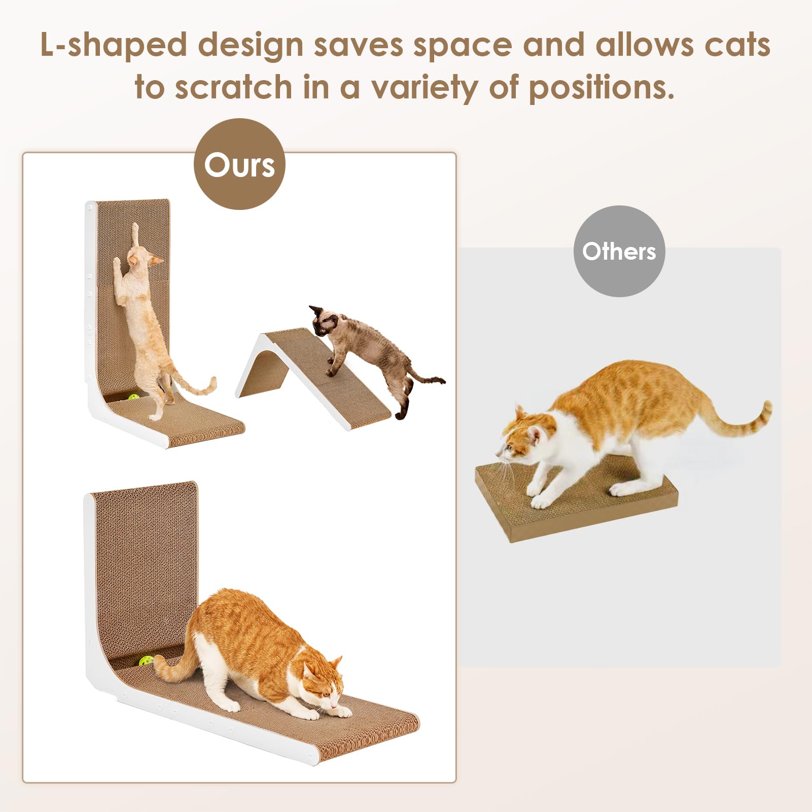 INNOVATIVE DESIGN: Our cat scratcher for indoor cats features an L-shaped design. Please place it against wall and sofa to protect your furniture. The L-shaped cat scratcher provides more scratching area for cats to scratch in a variety of positions.