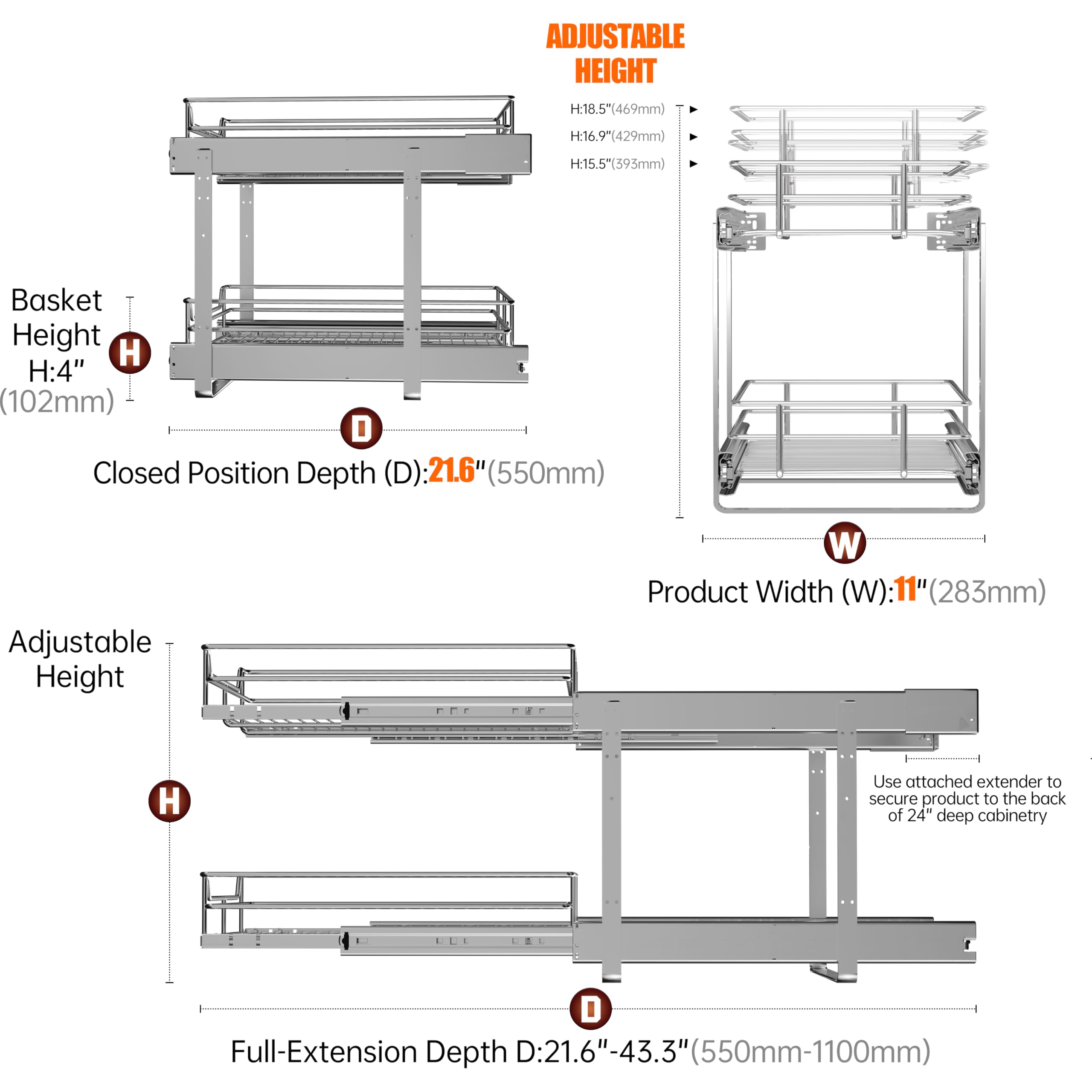 Height-Adjustable Sliding Shelves in Multiple Sizes: Our long pull-out steel wire baskets available in a range of sizes, Each offering (3) height adjustment settings, Perfect for optimizing storage in your deep cabinets