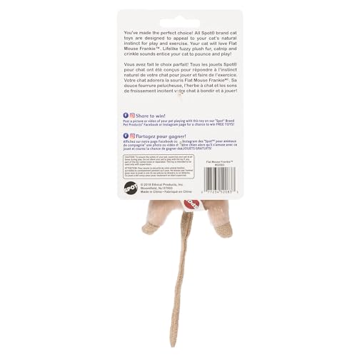 SPOT Flat Mouse Frankie w/ Catnip are designed to appeal to your cat's natural instinct for play and exercise. Your cat will love Flat Mouse Frankie. He is fuzzy just like a real mouse making him the perfect "prey" to hunt and attack. Lifelike fuzzy plush fur, catnip and crinkle sounds entice your cat to pounce and play. They are fun and playful toys for cats and kittens of all ages. The mouse-like toy provides hours of entertainment and stimulation for your cat. Cats love to bite, pounce, bat, and chase these enticing mice. Filled with catnip to drive cats wild. 5.5 inches long, colors may vary.