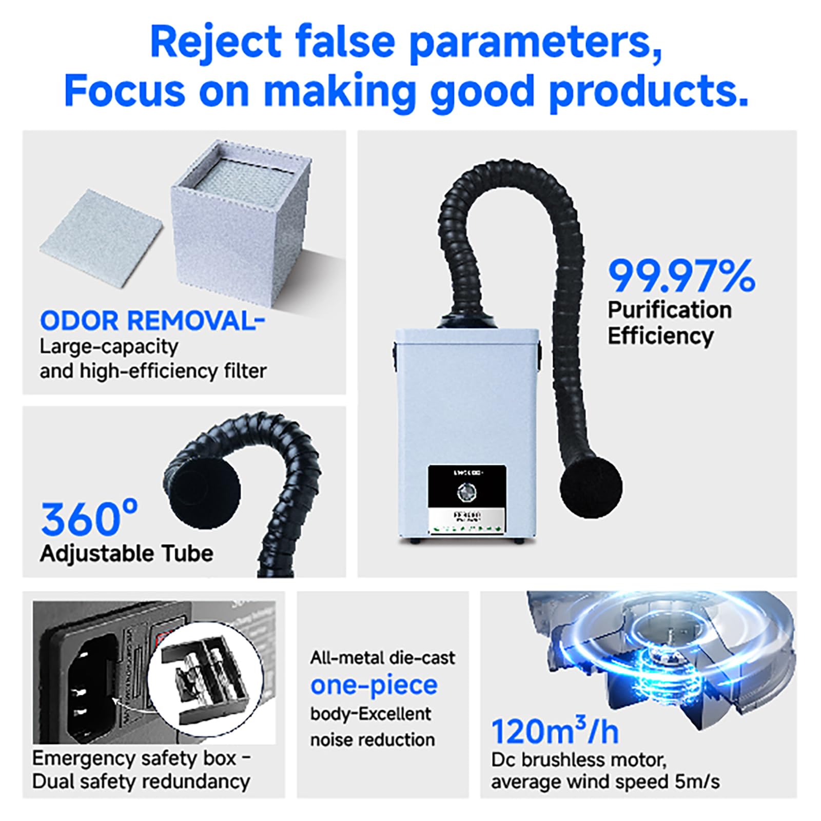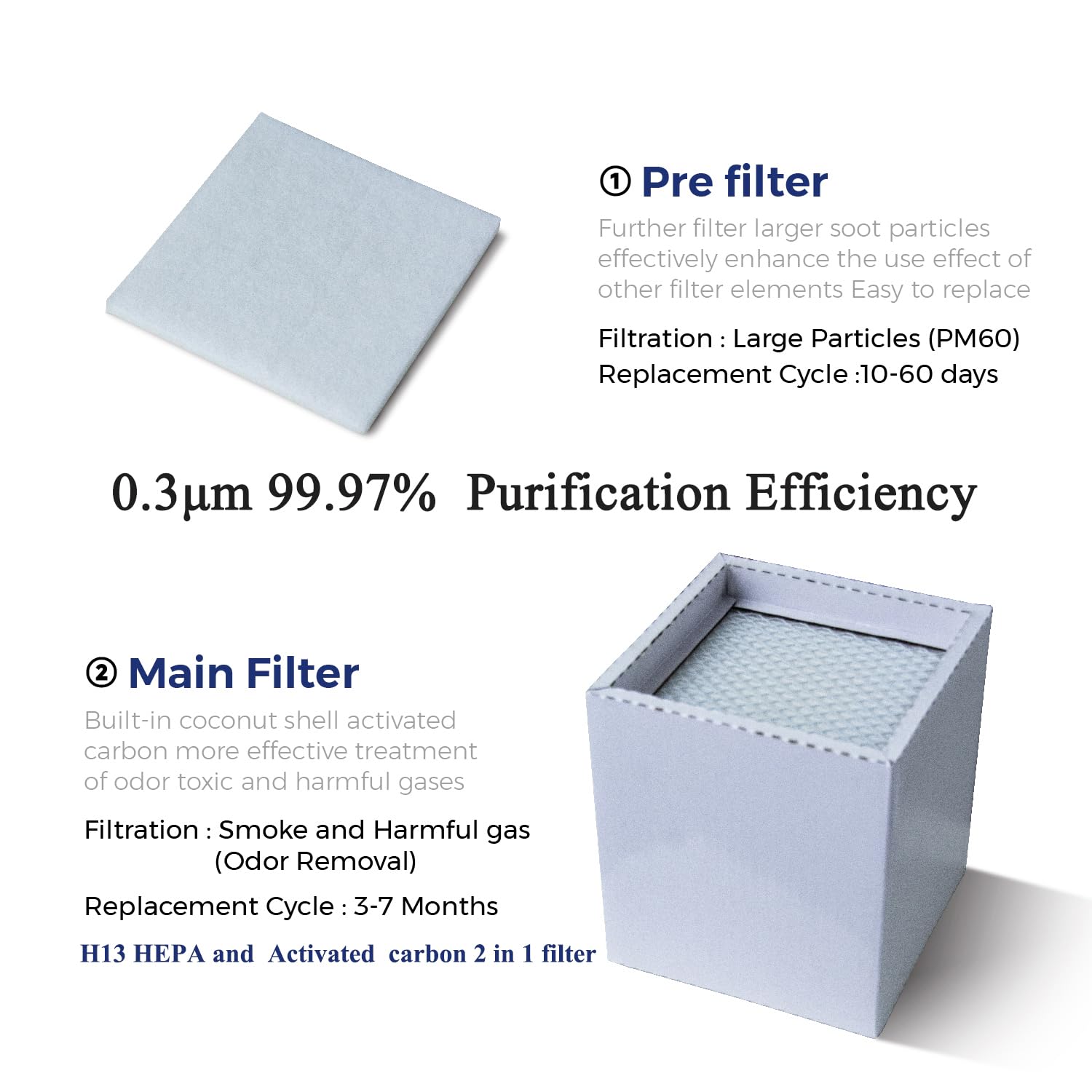 [𝟗𝟗.𝟗𝟕% 𝐇𝐢𝐠𝐡-𝐞𝐟𝐟𝐢𝐜𝐢𝐞𝐧𝐜𝐲 𝐏𝐮𝐫𝐢𝐟𝐢𝐜𝐚𝐭𝐢𝐨𝐧]: 100W High-power brushless DC motor to provide 200m³/h large air volume while keep low noise. powerful suction instantly captures fumes and particles. H13 HEPA and high iodine activated carbon filter can Efficiently captures fine PM0.3μm particles, removes harmful gases and odors, with a purification efficiency of up to 99.97%.
