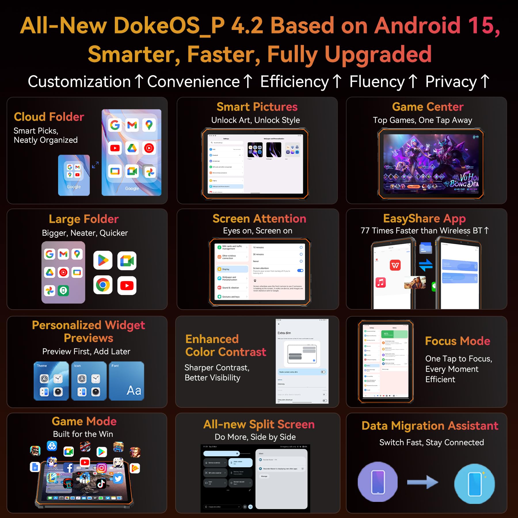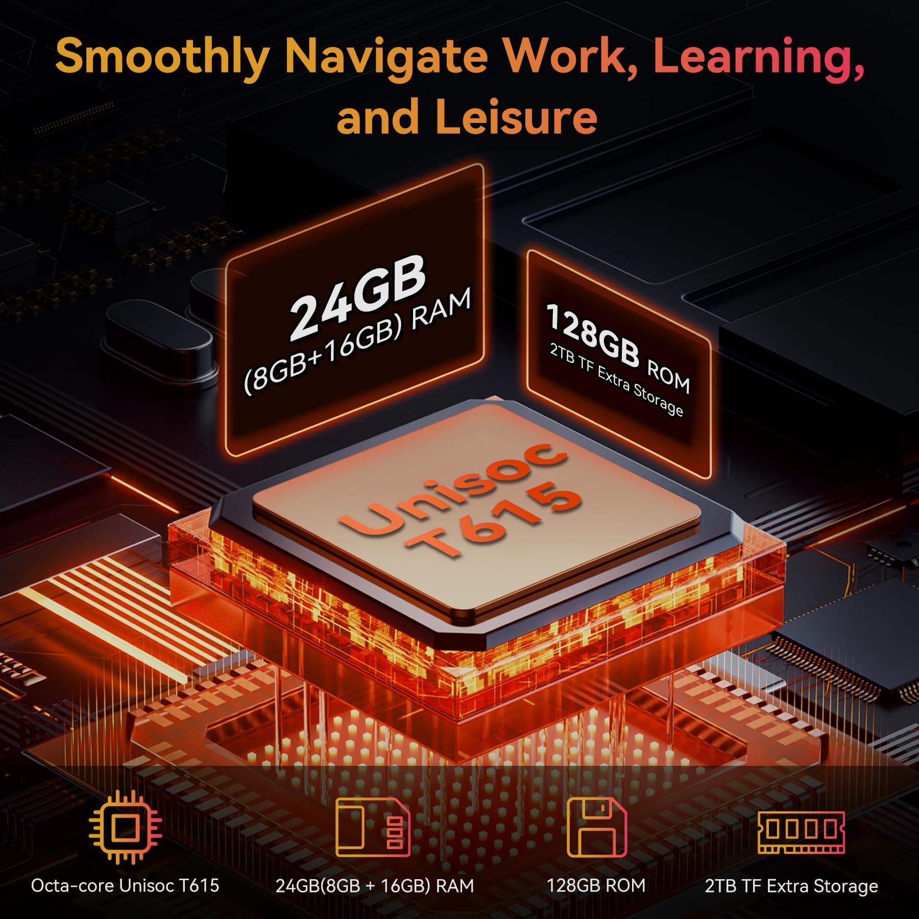 Comprehensive Connectivity: Dual-band WiFi (5GHz/2.4GHz) ensures stable wireless access wherever you go. OTG Support lets you connect USB drives, tools, or other peripherals with ease.8GB RAM with memory expansion technology supports an extra 16GB virtual extension. Moreover, this AI tablet has 128GB UFS high-speed storage and also supports TF card expansion, letting you easily expand storage beyond 128GB for more maps, videos, or work files.Running on Android 15, the Tablet Active 5 ensures smooth multitasking like running navigation, music, and logging apps simultaneously—perfect for seamless outdoor adventures and efficient work.