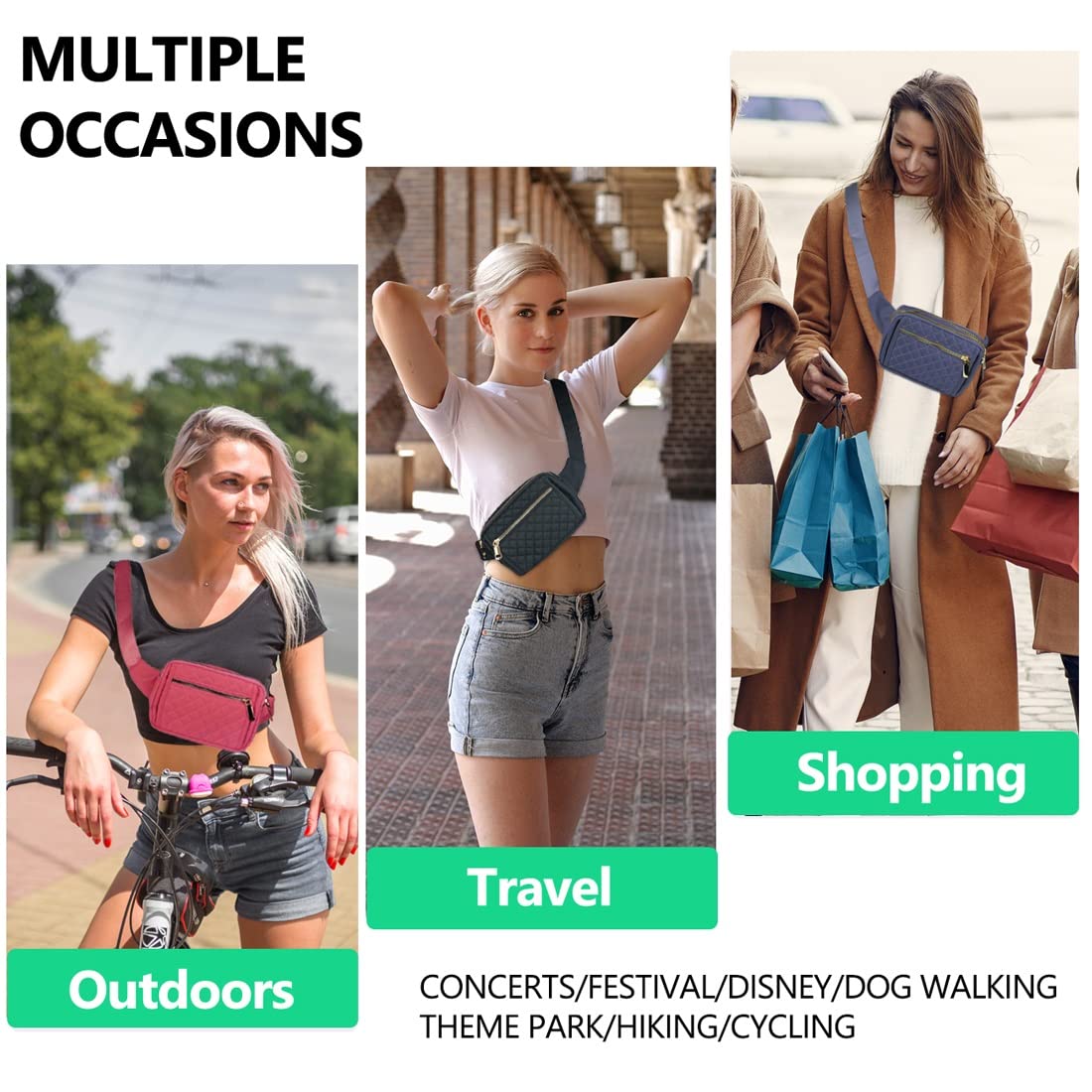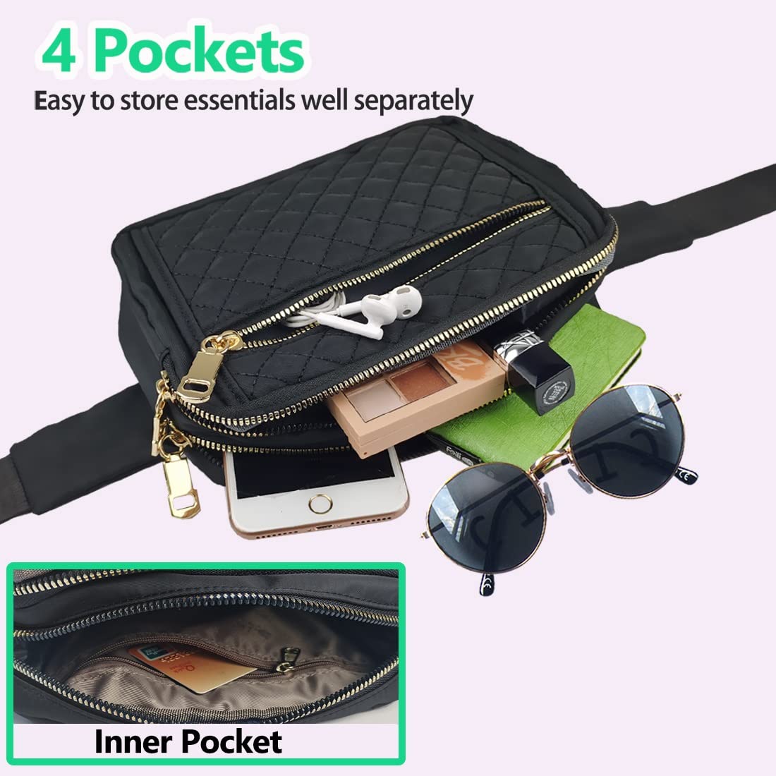 【PREMIUM MATERIAL】: Black women waist pack made of high quality fabric, the bum bags is sturdy and long-lasting usage. The front diamond-shaped checkered stitching design brings a unique shine to the fanny pack. Smooth zippers ensure users to have quick access to the items.