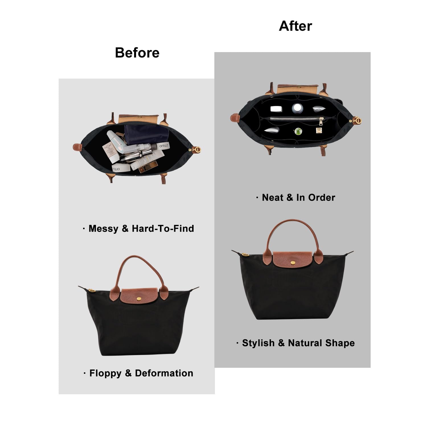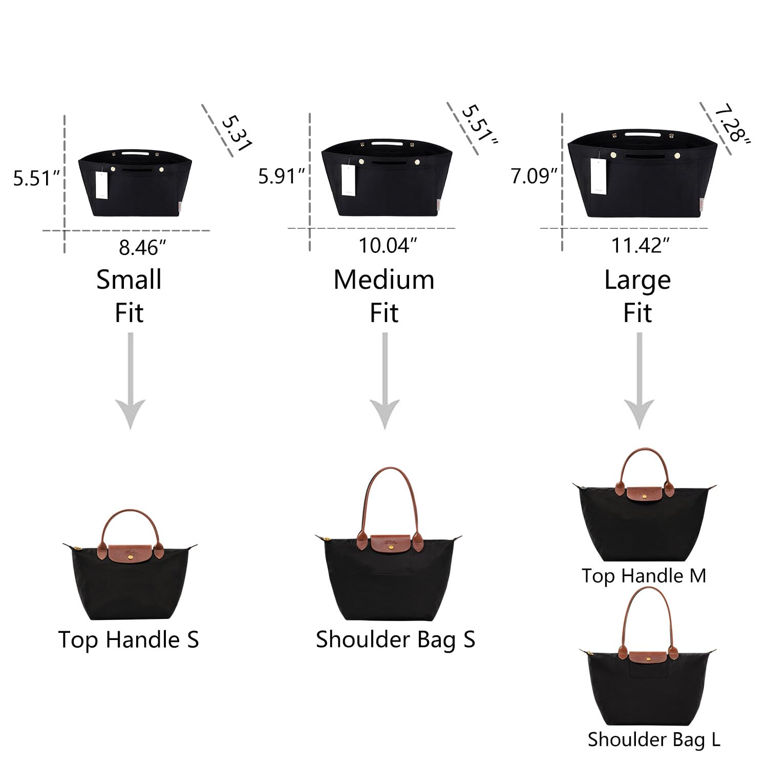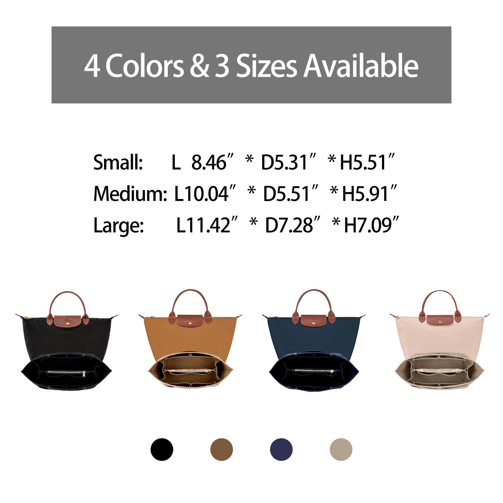 [❤Dimension Of Purse Organizer Insert For Handbags]: ✨ Small Purse Organizer: 8.46" (W) x 5.51" (H) x 5.31" (D) Fits le pliage Top Handle Small ✨ Medium Bag Organizer Insert:10.04" (W) x 5.91" (H) x 5.51" (D)Fits Le pliage Shoulder Bag Small ✨Large Tote Bag Organizer:11.42" (W) x 7.09" (H) x7.28" (D) fits Longchamp Le pliage Shoulder Bag Large And Top Handle M 💗Note: W*H*D refers to Length*Height*Width.