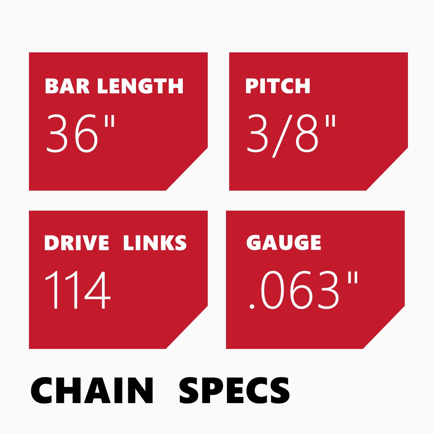 【SPECIFICATIONS】 1 Pack 36 Inch, 3/8" Pitch, .063" Gauge, 114 Drive Links, ripping chain, semi-chisel. Ripping chain is not for cross cutting firewood, but for slabbing and making boards. Do not use these chains for any type of cutting other than ripping. Saw chain does not comply with low kickback performance requirements.