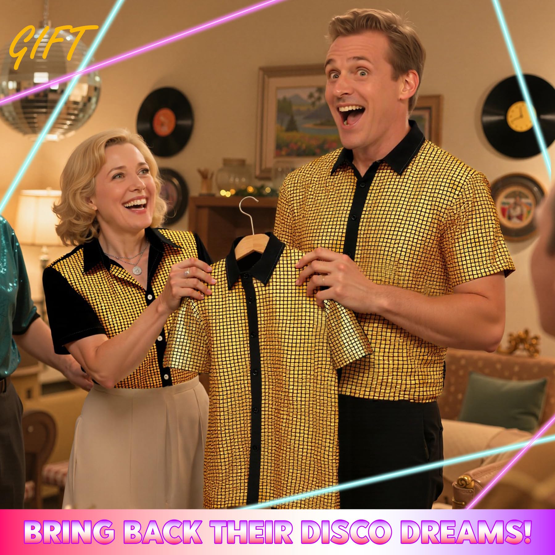 The Ultimate Gift:Treat your man to the ultimate retro surprise with this show-stopping mens disco shirt! Watch his eyes light up when he unwraps this 70s outfits for men masterpiece - whether he's your dance partner, a secret disco king, or just loves bold fashion. The sequin-studded short sleeve design makes this disco outfit men essential the perfect birthday, anniversary, or 'just because' gift he'll actually want to wear.