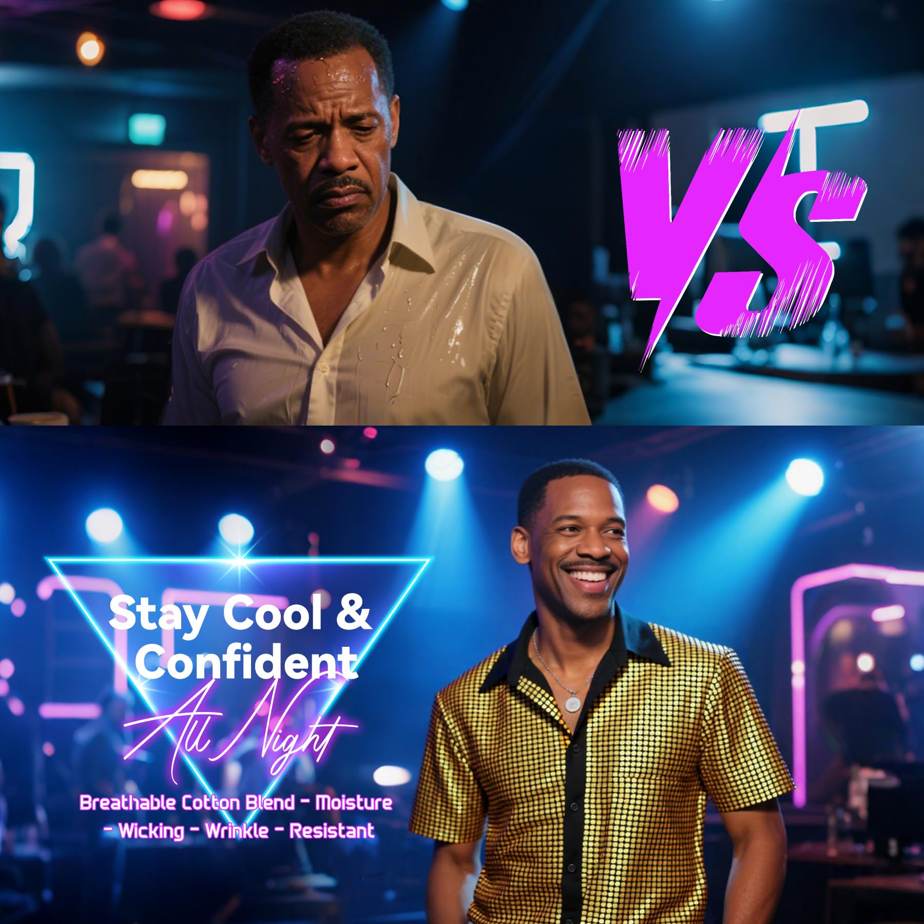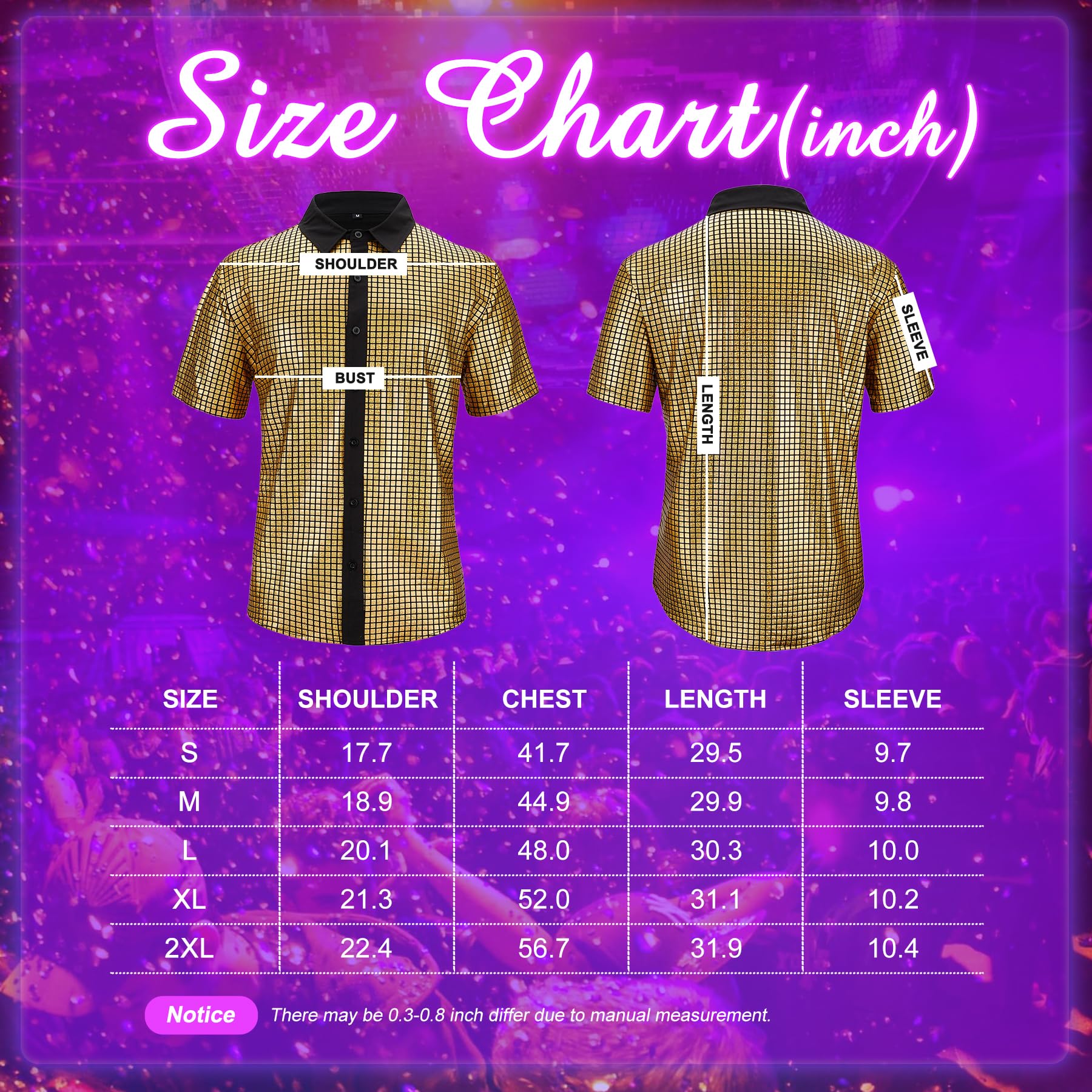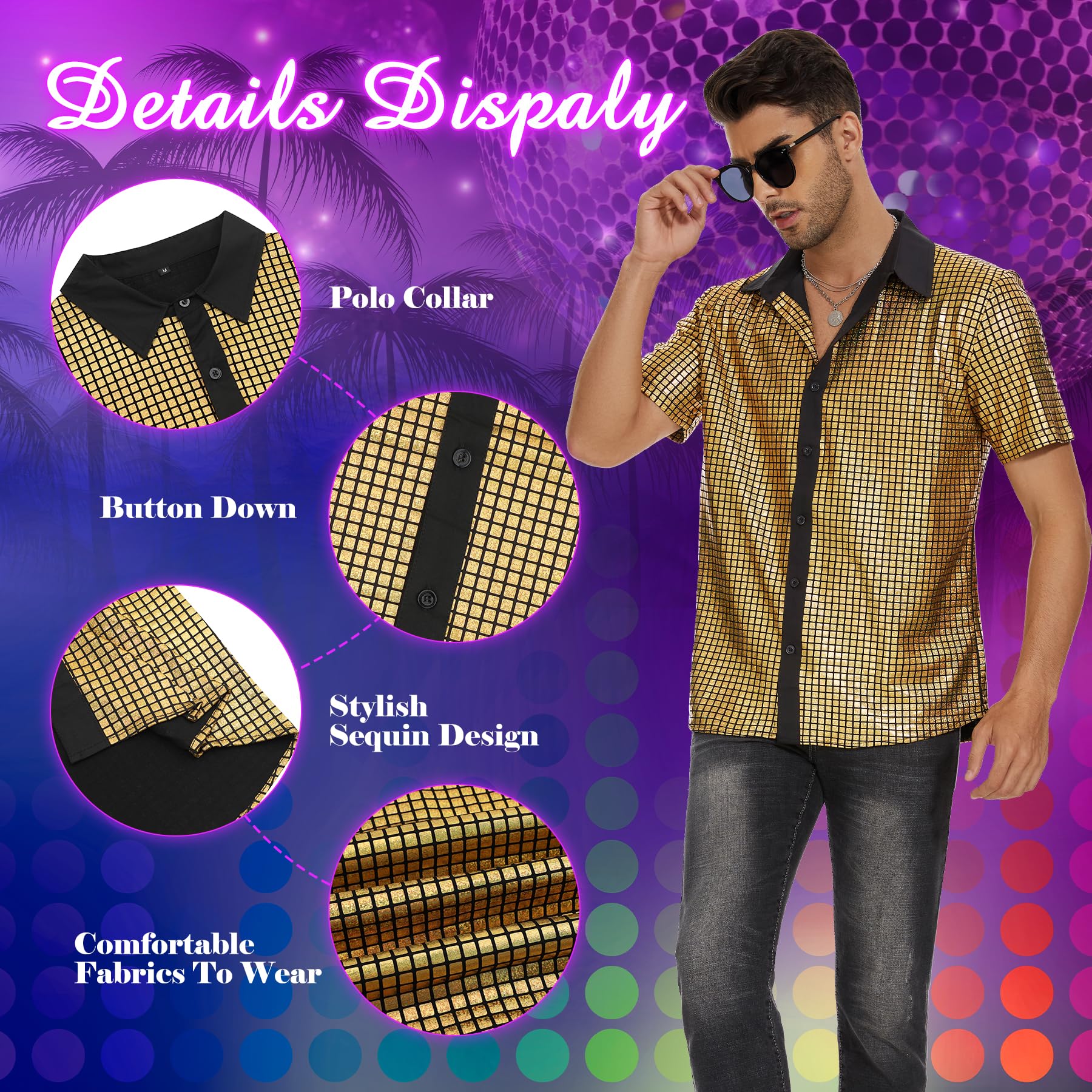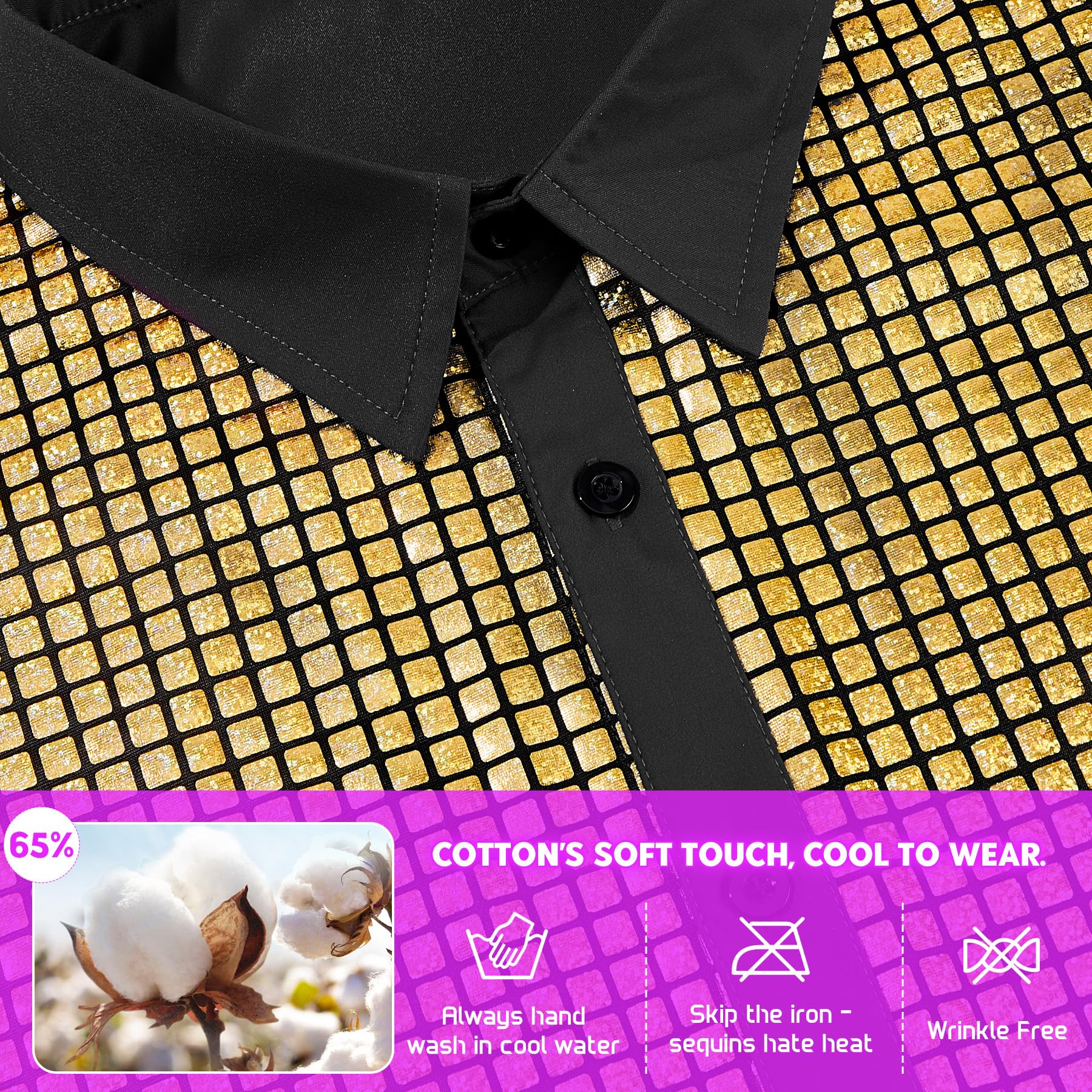 Breathable Cotton-Polyester Blend:The ultimate mens disco shirt crafted from 65% cotton & 35% polyester breathable enough for all-night dancing yet wrinkle-resistant for effortless care. This short sleeve retro top keeps its sharp 70s silhouette while feeling soft against your skin.Care Instructions: Hand wash recommended. Avoid machine washing and ironing to preserve the sequins.