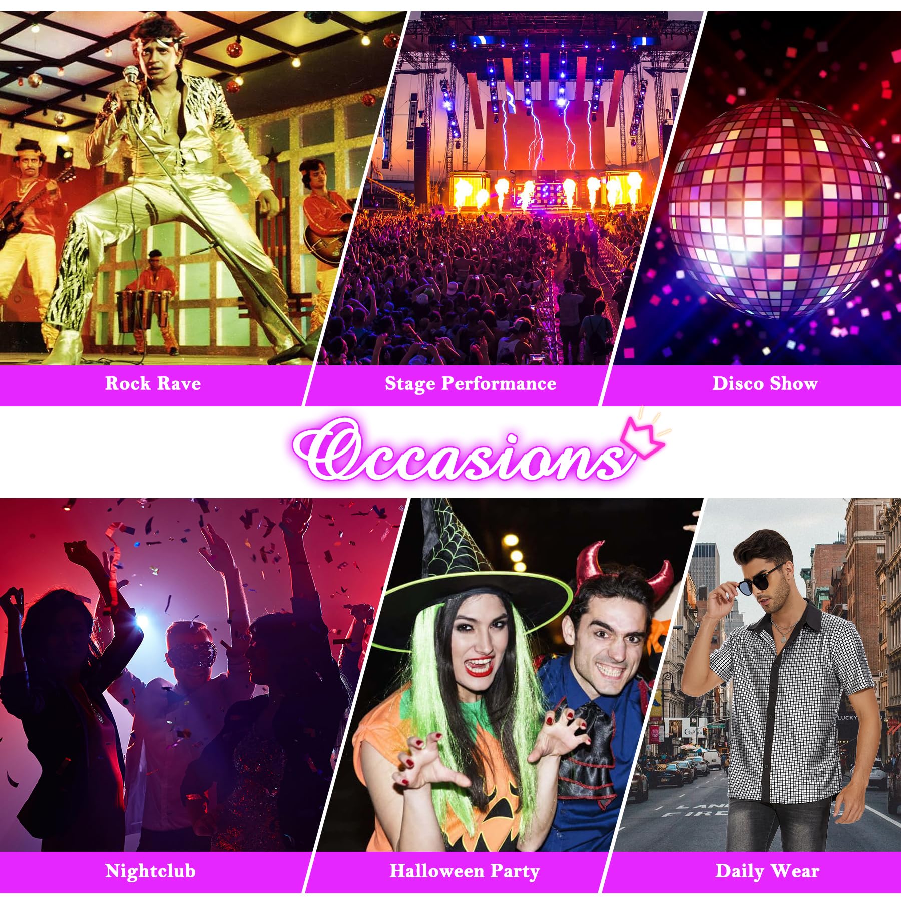 From Office to Party:From Halloween to NY parties, this short sleeve sequin superstar adapts to clubs, cosplay, or even bold office Fridays. Pair with flares/Sun Glass/Hairpiece/Necklace/leather shoes/Belt for full 70s glory or jeans for modern edge.