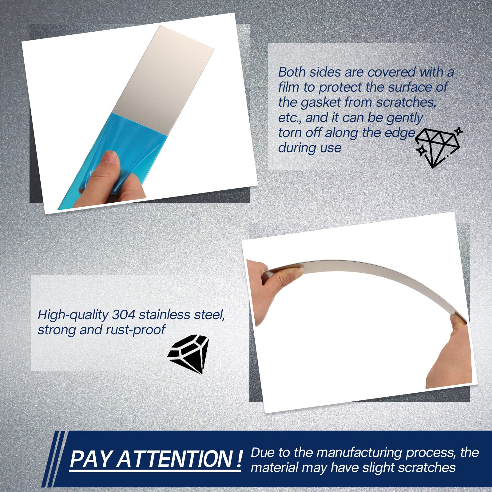 Sturdy 304 Stainless Steel Material: the stainless steel strips are made of 304 stainless steel, which is sturdy and long lasting, also rust proof and corrosion resistant, and not easy to break or fade. We also cover both sides of each gasket with films, which will not scratch the surface easily, so you can buy and use them with confidence