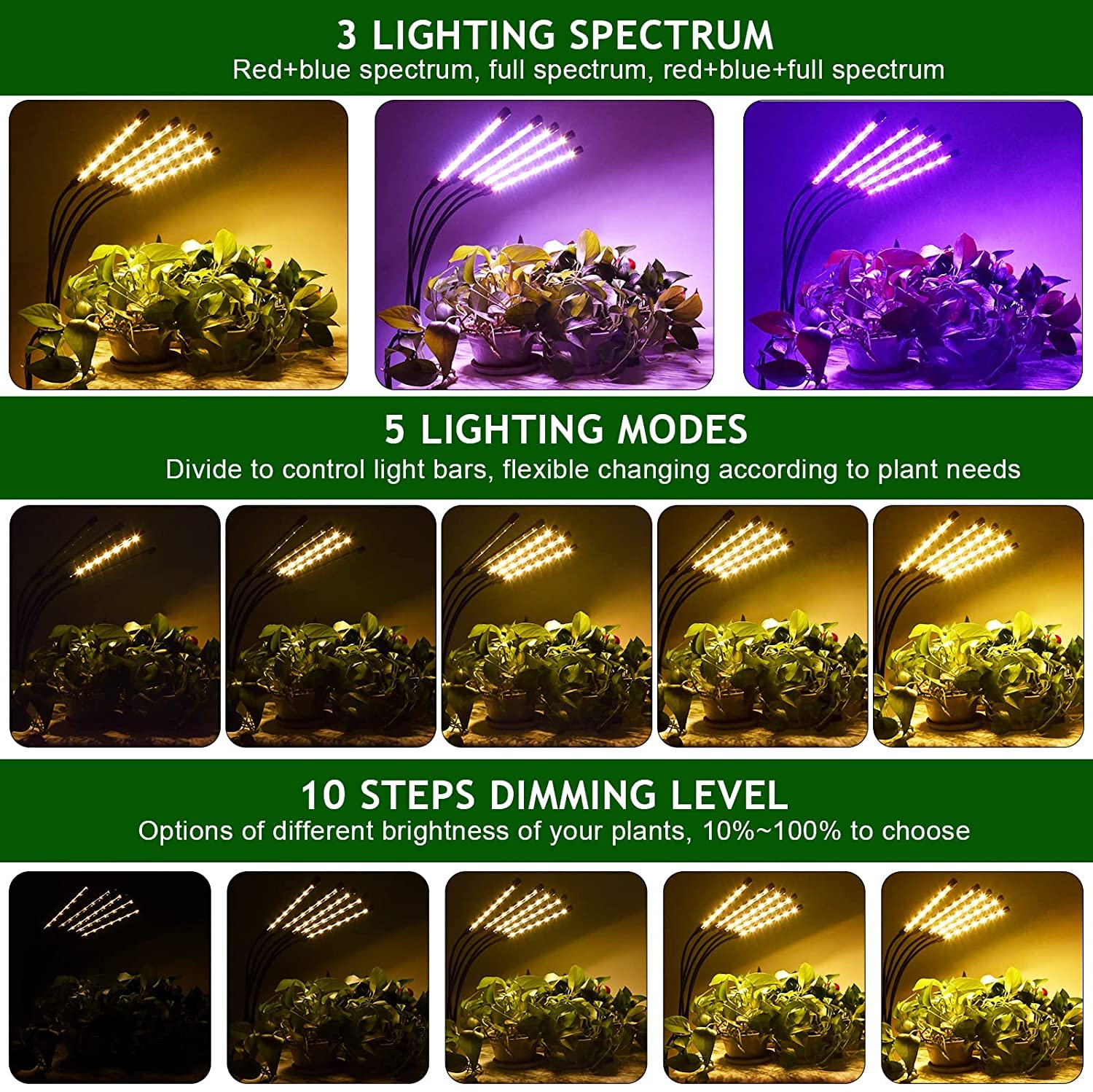 3 spectral modes / 10 levels of brightness: This 4-head grow light for indoor plants full spectrum can be set to Red+Blue, White, or a mix of White+Red+Blue. There are 10 dimming modes that can be adjusted to the desired brightness level, from 10% to 100%, to meet the lighting needs of plants at different growth stages