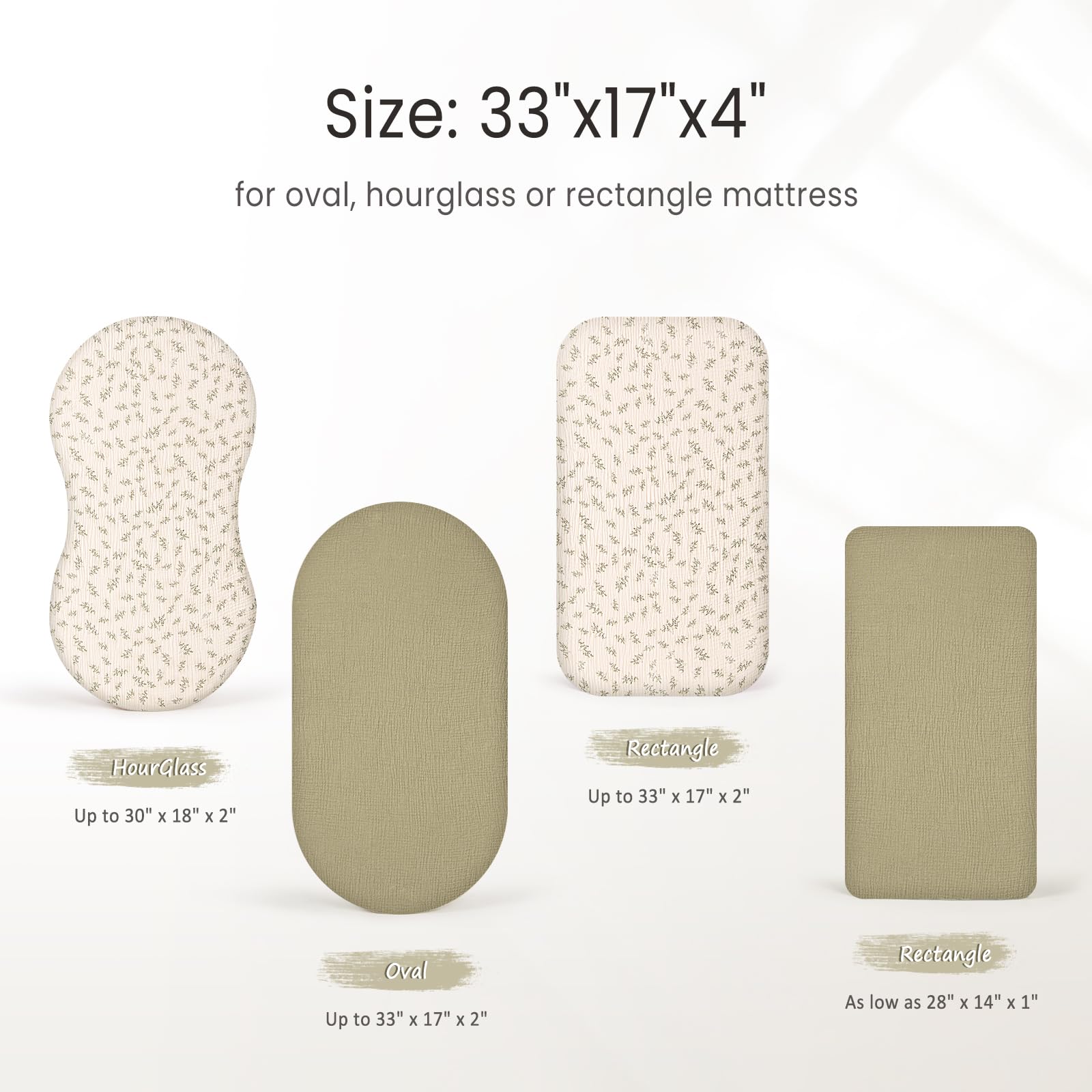 Flexible Fitted: Our bassinet sheets sized at 33" x 17" x 4" with elastic edges to securely fit most bassinet mattresses (29”-33” long, 14”-17” wide and 1”-2” thick). These bassinet sheets flexible fitted for Halo Bassinest Swivel Sleeper, 4moms MamaRoo Sleep Bassinet, and other similar-sized brands.