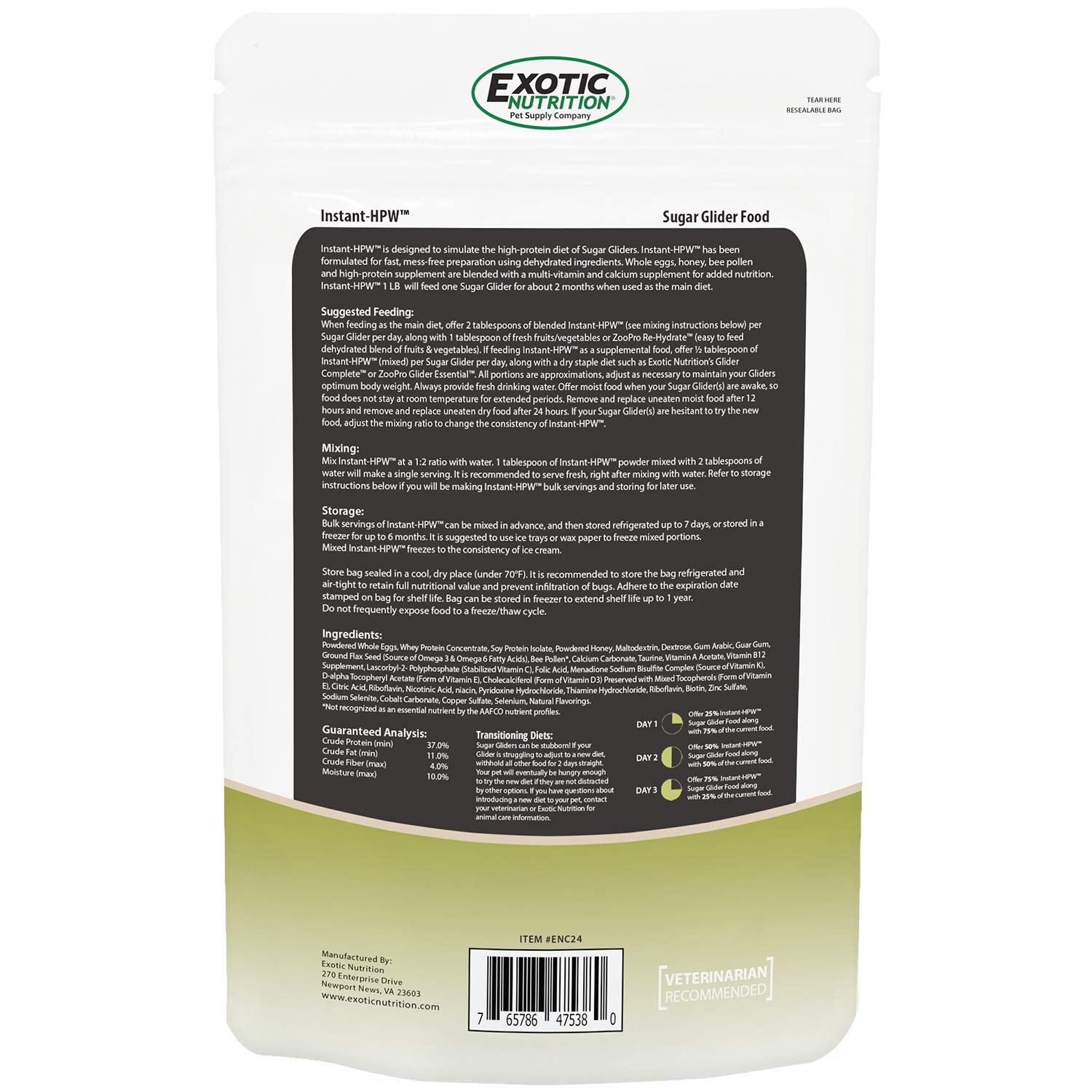 Exotic Nutrition's Instant-HPW is a favorite among glider owners. Instant-HPW includes the major ingredients from the original homemade HPW diet that is trusted and fed to sugar gliders worldwide. This homemade diet has been formulated into an easier, mess-free, pre-mixed form using dehydrated ingredients, and then fortified with Exotic Nutrition's Glider Booster (multivitamin) and Exotic Nutrition's Glider-Cal (calcium supplement) for added nutrition. FEATURES: ✔ NUTRITIOUS - Vitamin-enriched sugar glider diet, delicious vanilla flavoring ✔ CONVENIENT - Mixes with water...quick and easy to make fresh diet ✔ NATURAL - Natural ingredients include honey, eggs, bee pollen and Exotic Nutrition's ZooPro high protein supplement ✔ EASY - No washing, chopping or cutting fresh ingredients - simply mix with water ✔ EASY TO STORE - Serve fresh or freeze into individual servings Mixing Instructions: 1:2 ratio (1 tbsp of Instant-HPW powder with 2 tbsp of water). It is recommended to serve fresh, right after mixing with water. View the additional photos to see approximately how long a bag will last. 1 cup of Instant-HPW powder (mixed with 2 cups of water) will make approximately 16 servings when fed as the main diet and can be store in the refrigerator up to 7 days. If storing mixed formula for longer than 7 days, freeze (up to 6 months) using ice trays. Instant-HPW freezes to the consistency of ice cream. Storage Instructions: Store sealed in a cool, dry place. Refrigeration is strongly suggested. Powdered formula can be stored in freezer for up to 1 year.