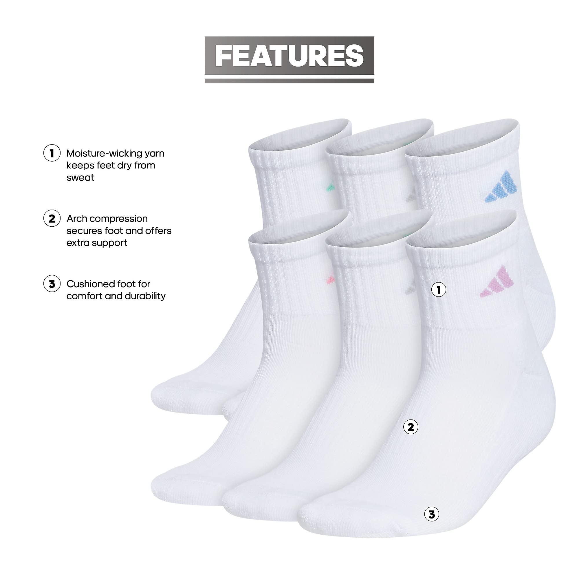Description Quality, comfort, and durability are what you are looking for in your everyday sock and the adidas 6-pack delivers on all of your needs. Now, with the addition of arch compression, this sock delivers a secure fit and gives you the best sock to handle your day to day. Suitable for womens socks size 9-11, womens socks size 7-9, and available as womens quarter socks; these socks cater to various preferences and needs. Perfectly crafted for womens sport socks or athletic socks women, the adidas 6-pack is designed to support your active lifestyle. Also suitable for those seeking quarter socks women, these socks are versatile and functional as womens socks.