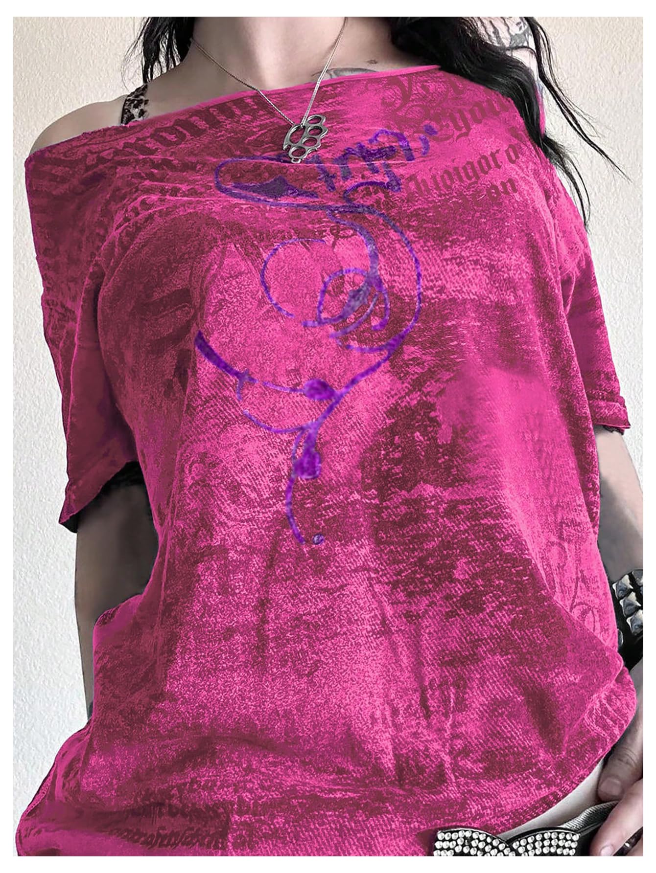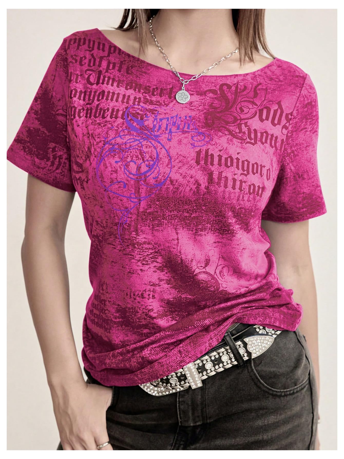 Features: graphic print, halfsleeve, boat neck, drop shoulder, goth tee shirts, y2k trendy tee tops