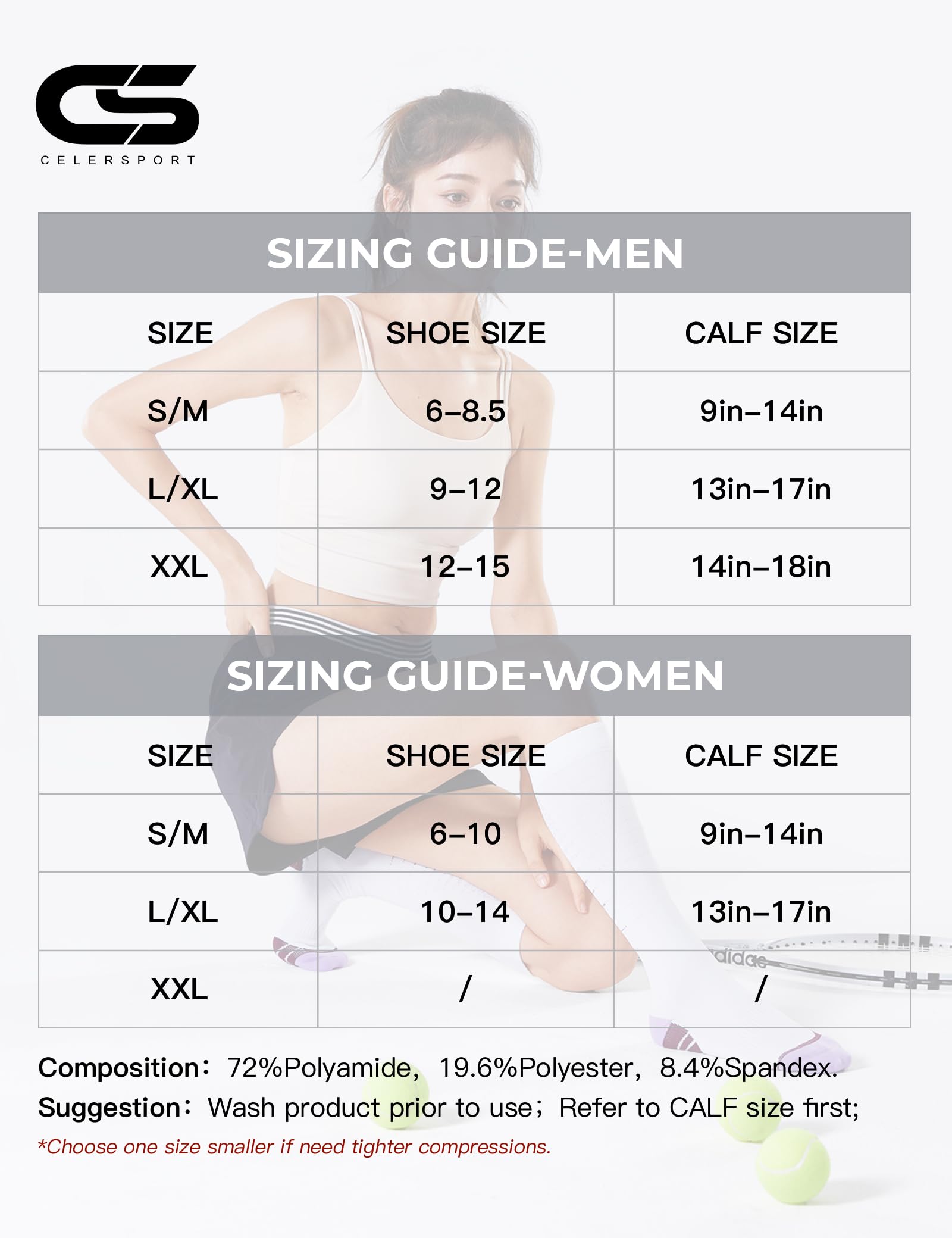 MENS SIZE: (S/M-Shoe Size 6-8 - Calf Size 9-13in) (L/XL-Shoe Size 8.5-11.5 - Calf Size 13-16in) (2XL-Shoe Size 12-15 - Calf Size 14-17in) WOMENS SIZE: (S/M-Shoe Size 6-9.5 - Calf Size 9-13in) (L/XL-Shoe Size 10-14 - Calf Size 13-16in)