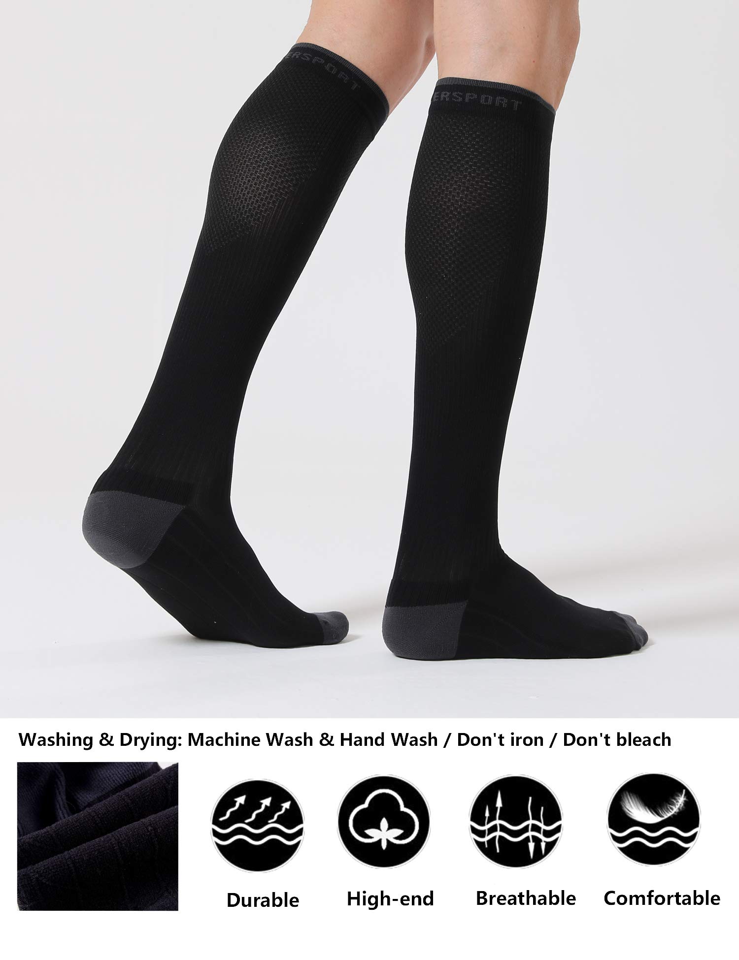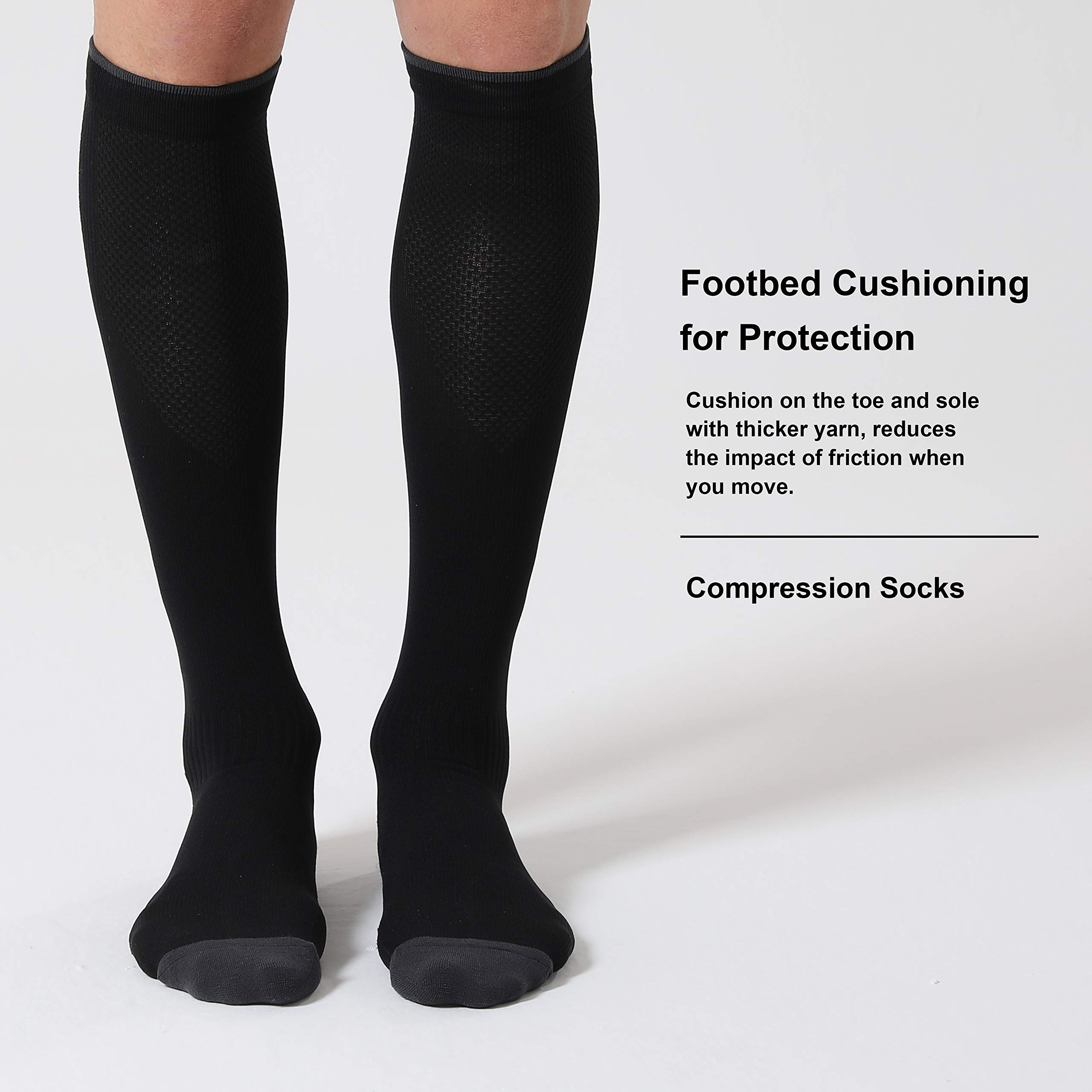 Friction & Shock Protection: Our mens compression socks use the seamless toe design, these compression socks for men circulation have targeted cushioning on the footbed for shock absorption, Cushion on the toe and in bottom with thicker yarn , reduces the impact and friction when your move, and increasing the performance and durance.