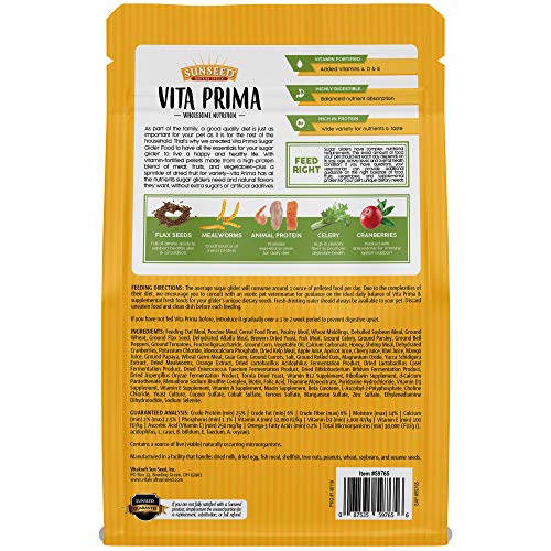 As part of the family, a good quality diet is just as important for your pet as it is for the rest of the household. That’s why we created Vita Prima Sugar Glider Food to have all the essentials for your sugar glider to live a happy and healthy life. With vitamin-fortified pellets made from a high-protein blend of meat, fruits, and vegetables—plus a sprinkle of dried fruit for variety—Vita Prima has all the nutrients sugar gliders need and natural flavors they want, without extra sugars or artificial additives.