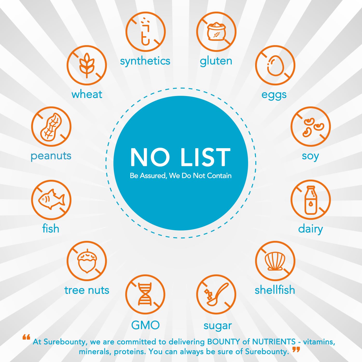 No Allergens or Nasties: Surebounty has always been dedicated to formulating supplements that cater to people from all walks of life and can easily fit into their daily routines. We want you to enjoy the amazing benefits brought by our products without worrying about getting allergic. Be Assured: NO GMOs, soy, gluten, milk, sugar, egg, wheat, corn, nut, fish, shellfish. And never will you find Nasties like artificial ingredients, fillers, binders, or preservatives in Surebounty!