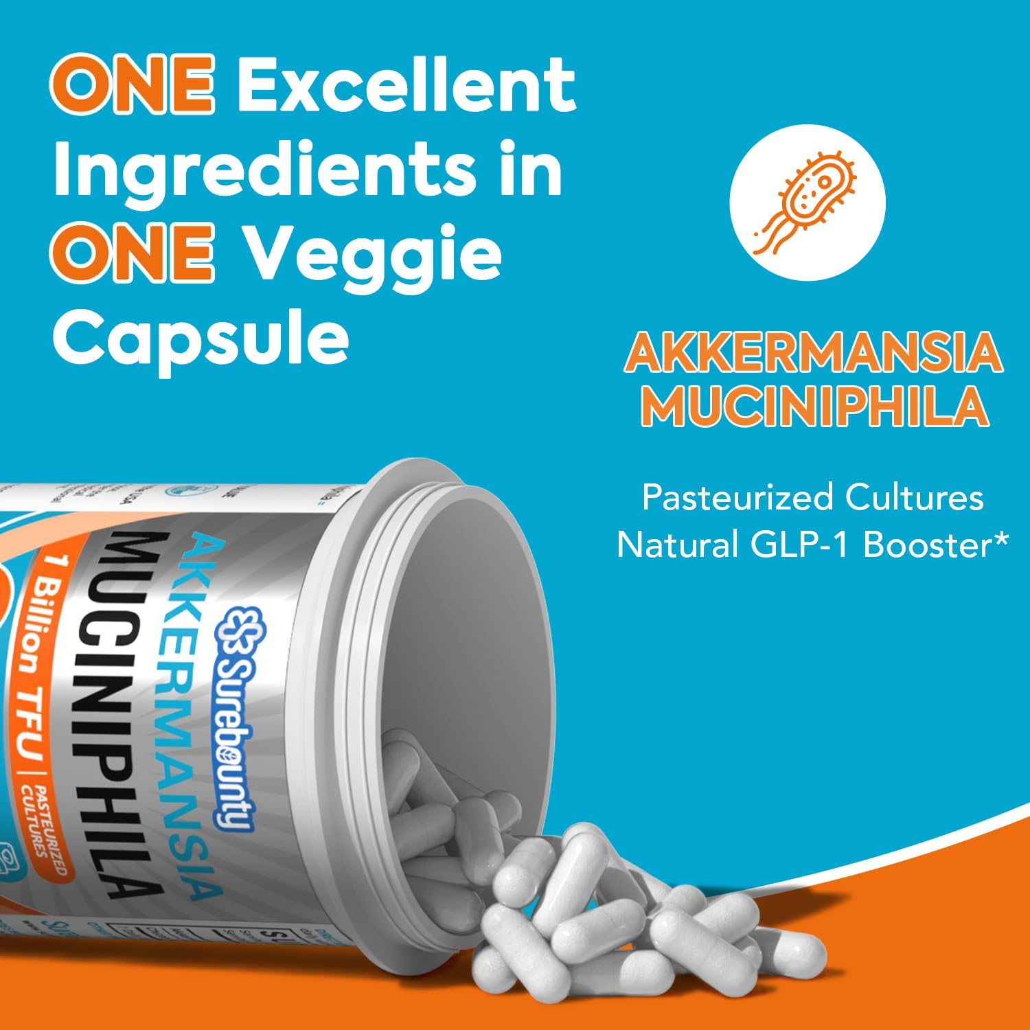 Natural GLP-1 Booster*: Surebounty’s 1 vegan capsule packs cutting-edge probiotic & prebiotic – 1 billion of pasteurized akkermansia muciniphila and 200 mg of chicory inulin - specially designed to support the body’s natural GLP-1, metabolism, and digestion.* Take One vegan capsule daily, Feel Light, Eased & Energetic with Surebounty Akkermansia Muciniphila!*