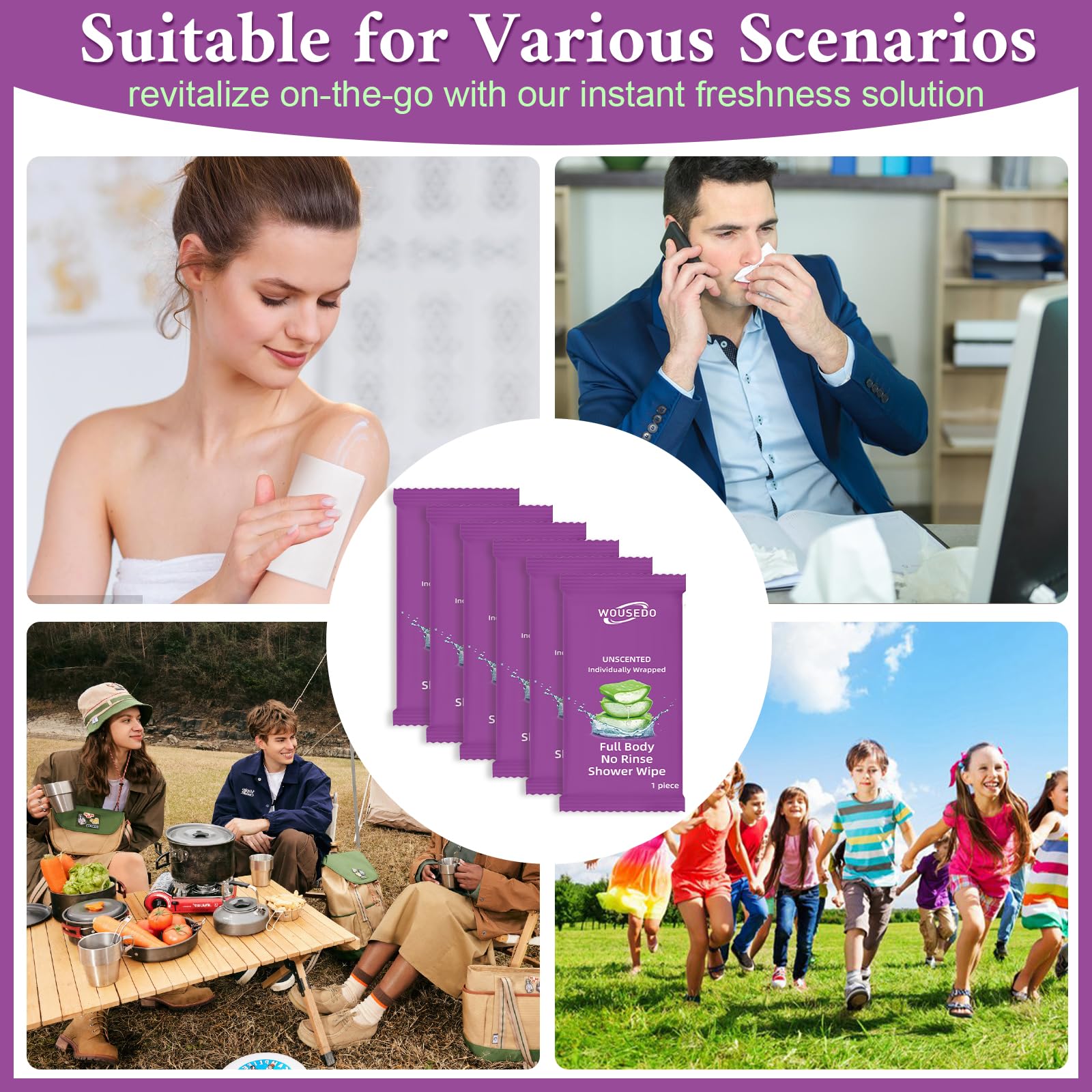Wide Applications: Our body wipes are suitable for all age groups and can be applied in a variety of scenarios. Whether you are traveling, camping, exercising, or just need a quick refreshment during the day, our shower wipes are always handy. They are a convenient and efficient cleaning solution that fits your active lifestyle, suitable for home, office, gym and other outdoor settings.