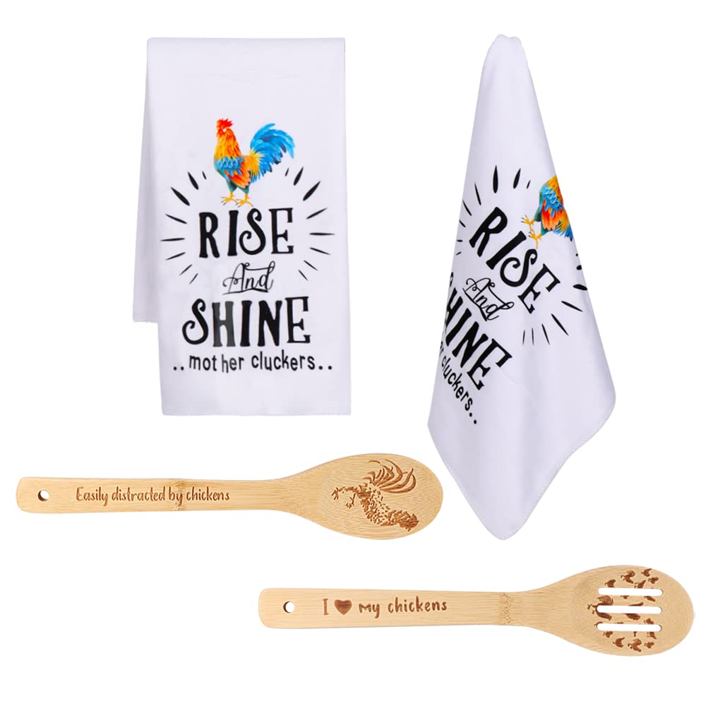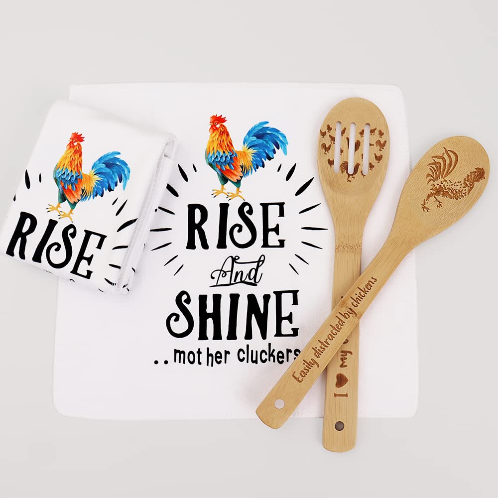 Great Gifts: Decorated with funny sayings and farm animals rooster, chicken, this rooster kitchen towels and spoons sets will surprise your family and friends,make a perfect housewarming gifts for new home, or chicken gifts, Mother Day gifts, birthday gifts.