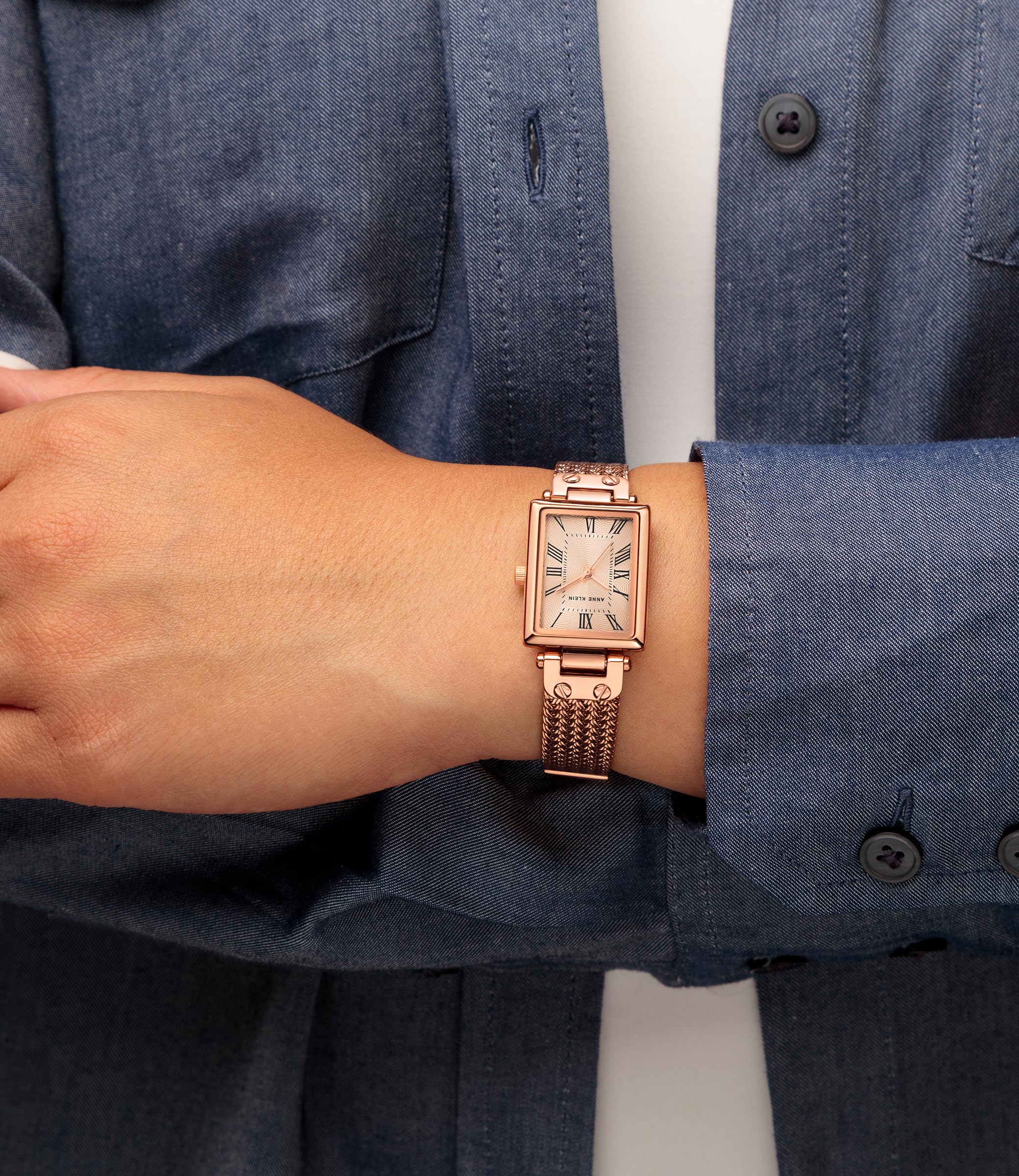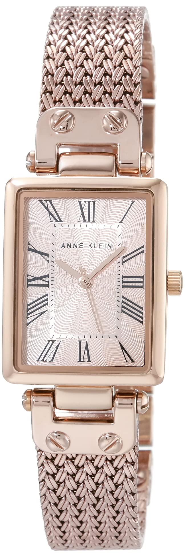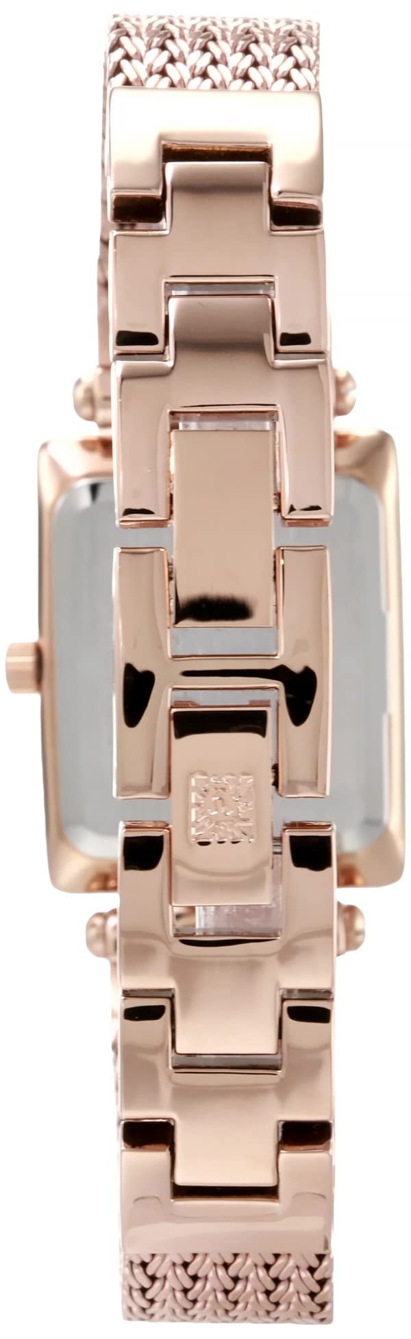 Description This rectangular watch boasts a mineral crystal lens and a sleek, rectangular case. Its dial showcases indexes and an inner minute track. The mesh bracelet is equipped with adjustable end links, a jewelry clasp, and an extender. Notably, it is not water resistant.