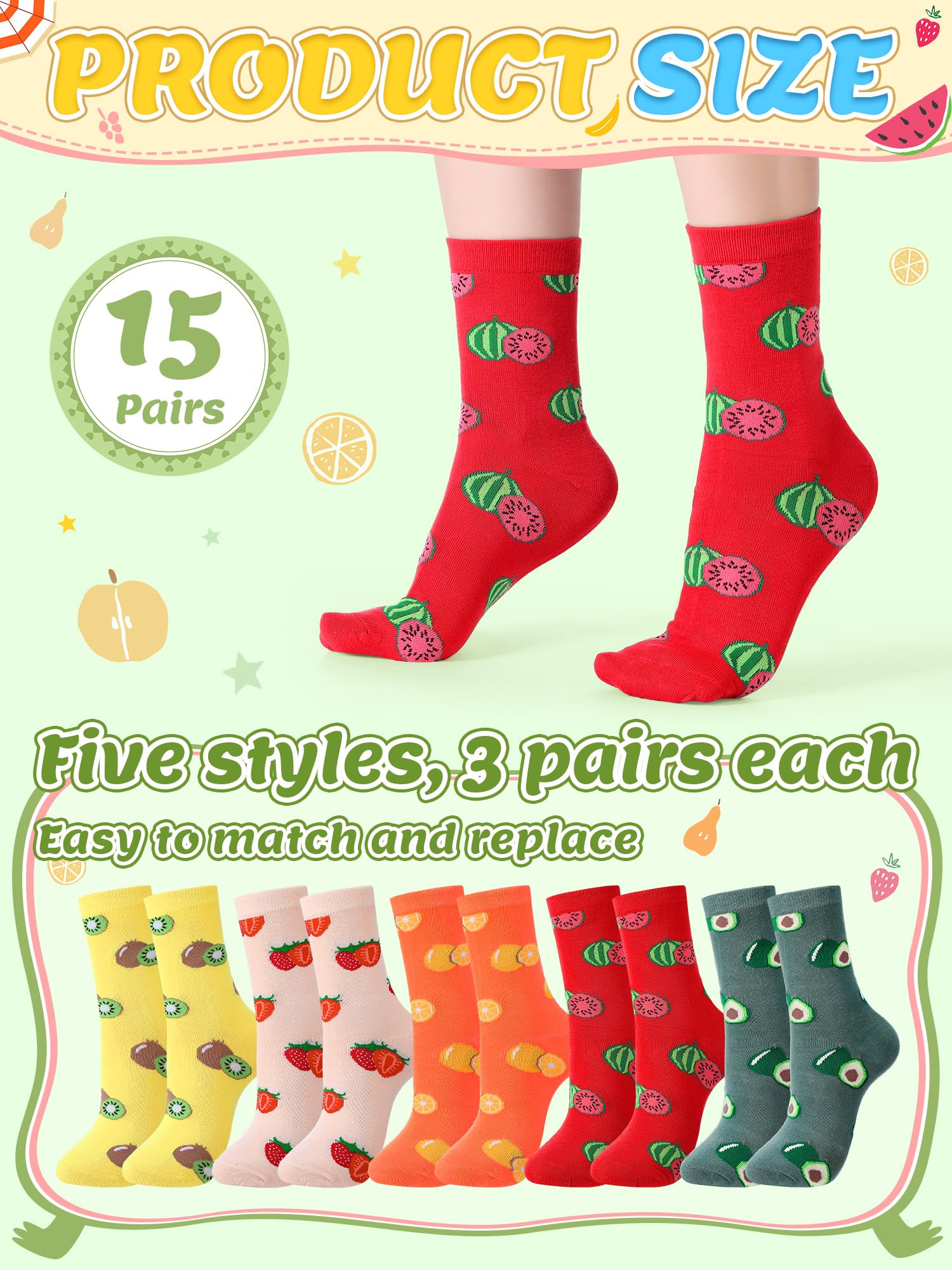 Packaging Includes: you will receive 15 pairs of women fruit socks in different colors, totaling 5 colors, with 3 pairs of each color; The quantity is sufficient, and the combination is complete; The fabric is smooth, soft, and durable, resistant to pilling, meeting your daily use and replacement needs