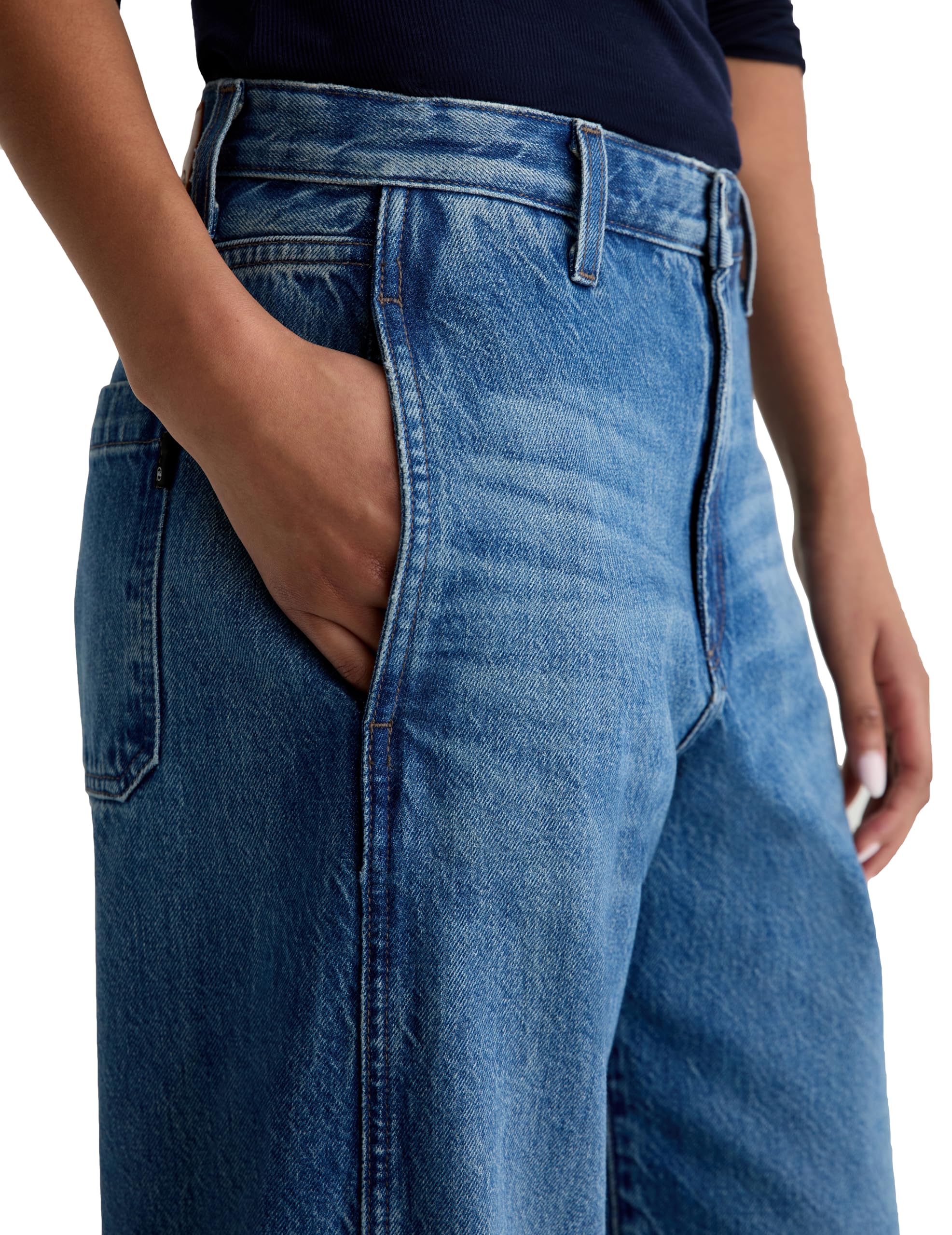 The Mercer Cuffed Barrel Jean has a high rise, loose top block and curved outseam. Side seam pockets create a clean front look. Finished with a large double cuffed hem and darts at the knee.