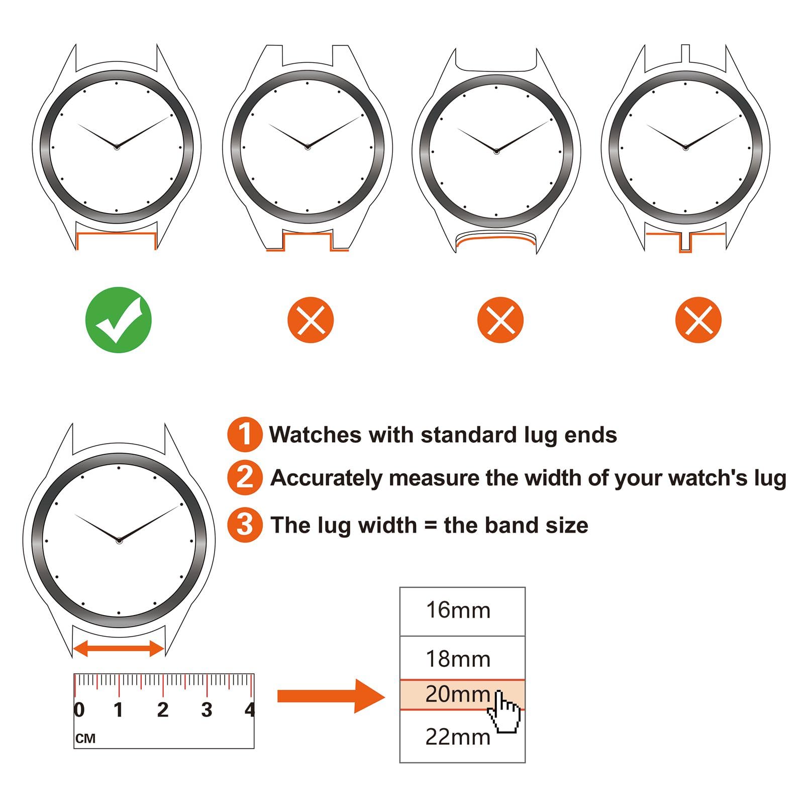 Straps are available in 16mm, 18mm, 20mm, 22mm widths. To determine the proper width for your watch, use a metric ruler to measure the ‘lug width’ (the point on the watch head where the band attaches)