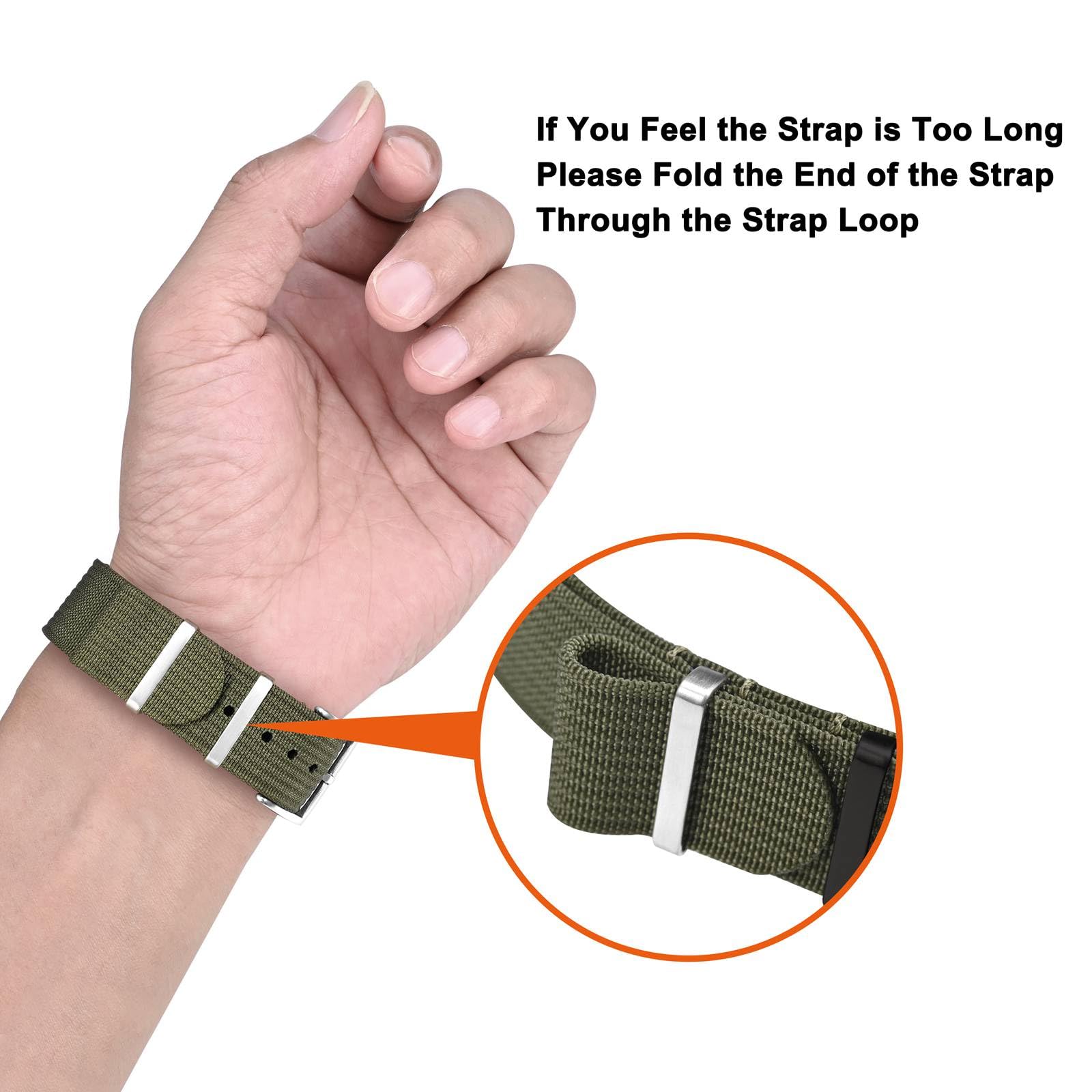 One-piece straps are extra-long by design, total length: 280-295mm(11-11.6inches), with 11-13 holes that fit wrists from 6.1” to 9” in circumference, if the band is longer than desired, the free end can be folded neatly back into the loop