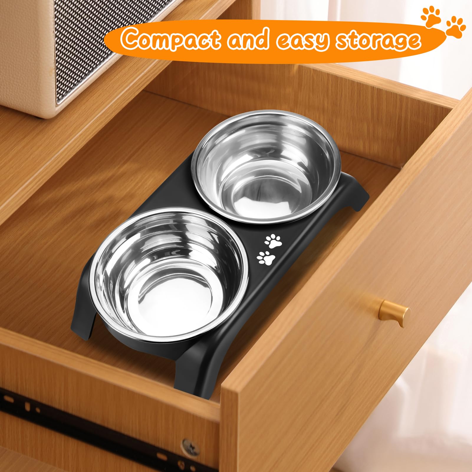 đđ±ăDual 5â Stainless Steel Bowls: Perfect for Small Petsâ Daily NeedsăComes with TWO 5-inch food-grade stainless steel bowlsâperfectly sized for your puppyâs portioned kibble and your catâs wet/dry food (separate bowls for food + fresh water!). The bowls nest securely in the stand, and non-slip rubber pads on the tray prevent skiddingâeven when your eager puppy gobbles fast or your cat bats at the water bowl. Smooth curved edges make refills and pickups a breeze!