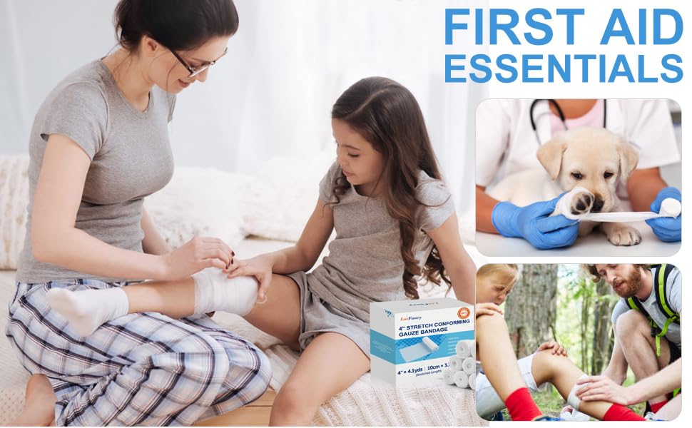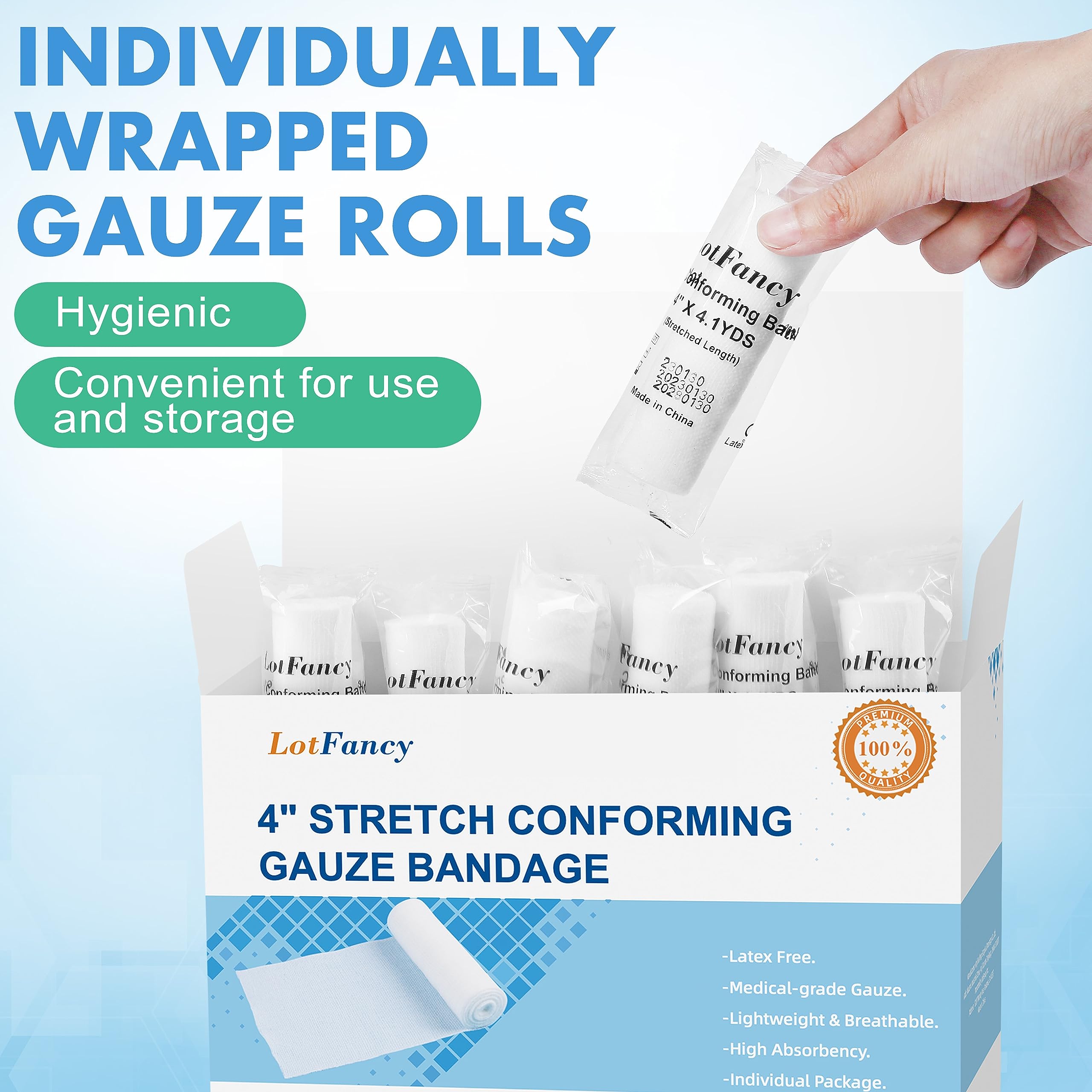 STRETCHABLE CONFORMING GAUZE: Our 4-inch gauze roll works well on knee, arm, leg, wrist, elbow, ankle, hands and any body parts, and provides optimal coverage of various wound types; Cut-to-fit versatility as compression wrap or overlap dressing