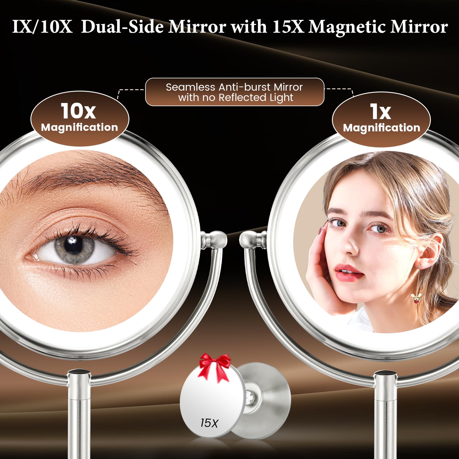 【True 1X/10X/15X HD Magnification, Oversized Zero Optical Distortion Mirror】1X/10X/15X Sides achieve over 10 Million Pixels HD Mirror Effect. 8.5 inch extra-large size 1X mirror offers a wide-angle view to pair hairdos with makeup. Easily rotate to the 10X/15X magnifying side, uses the optical principle of No Pixels Loss Magnification to ensure zoom in on every facial details without distortion. Enjoy meticulous makeup and skincare with a lighted mirror with magnification!