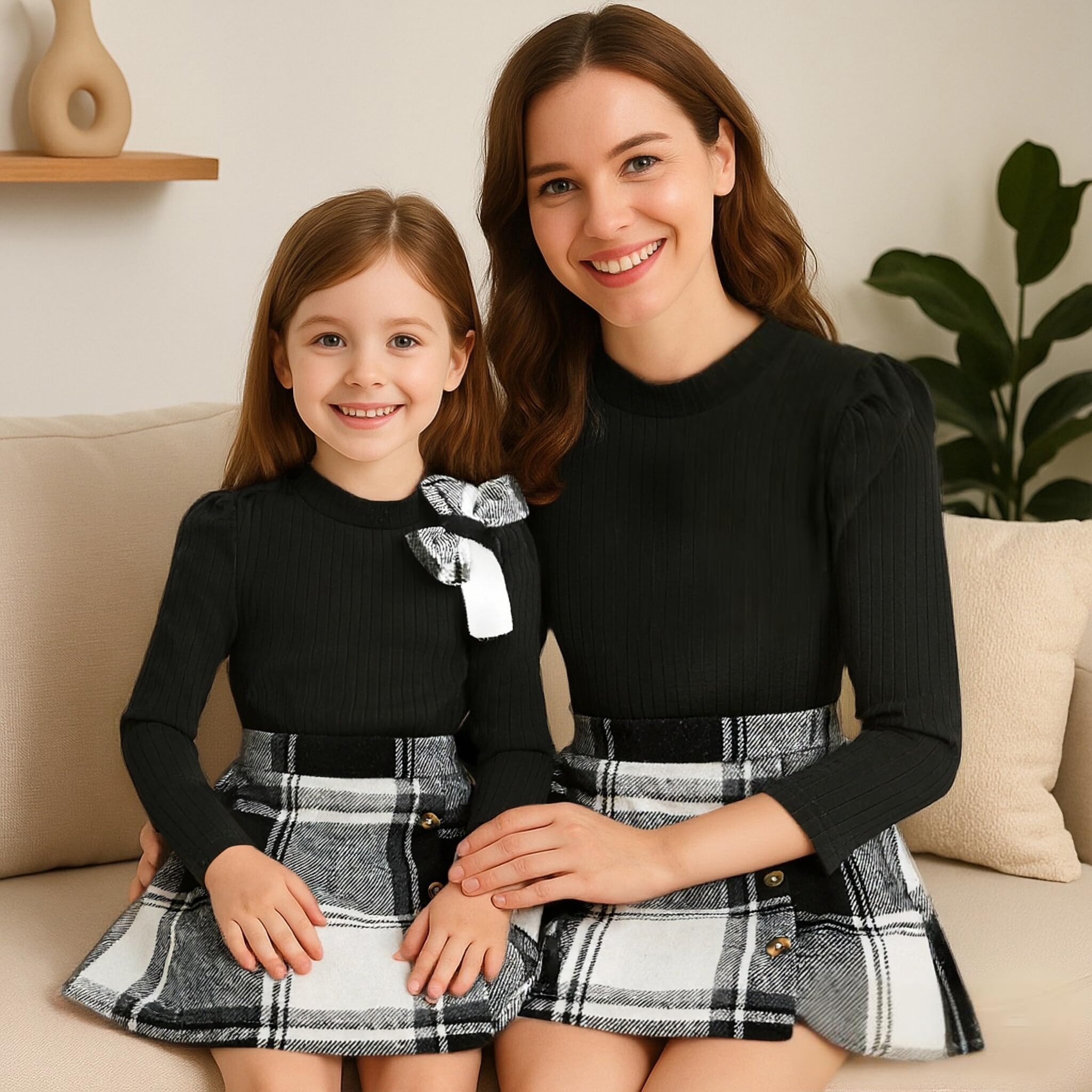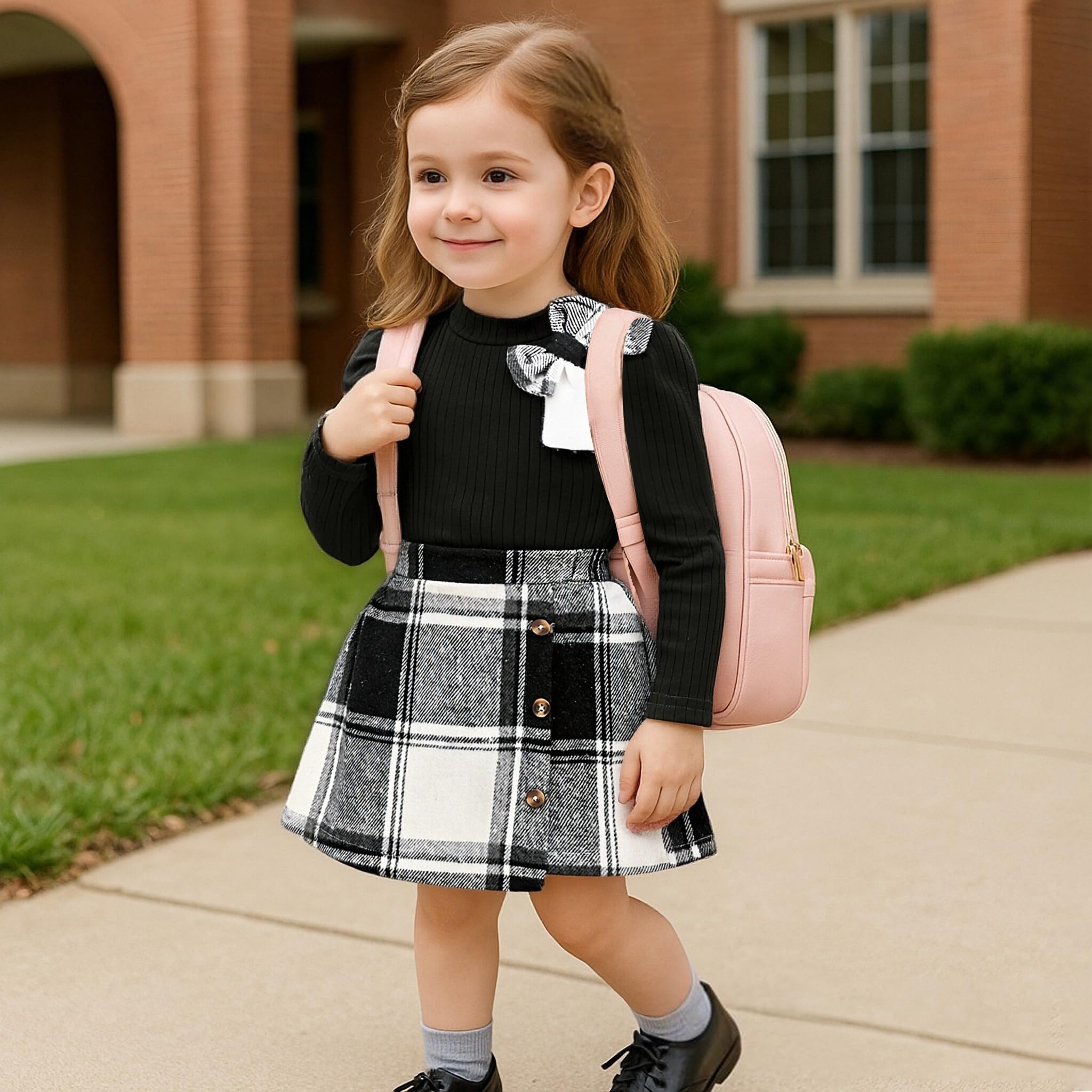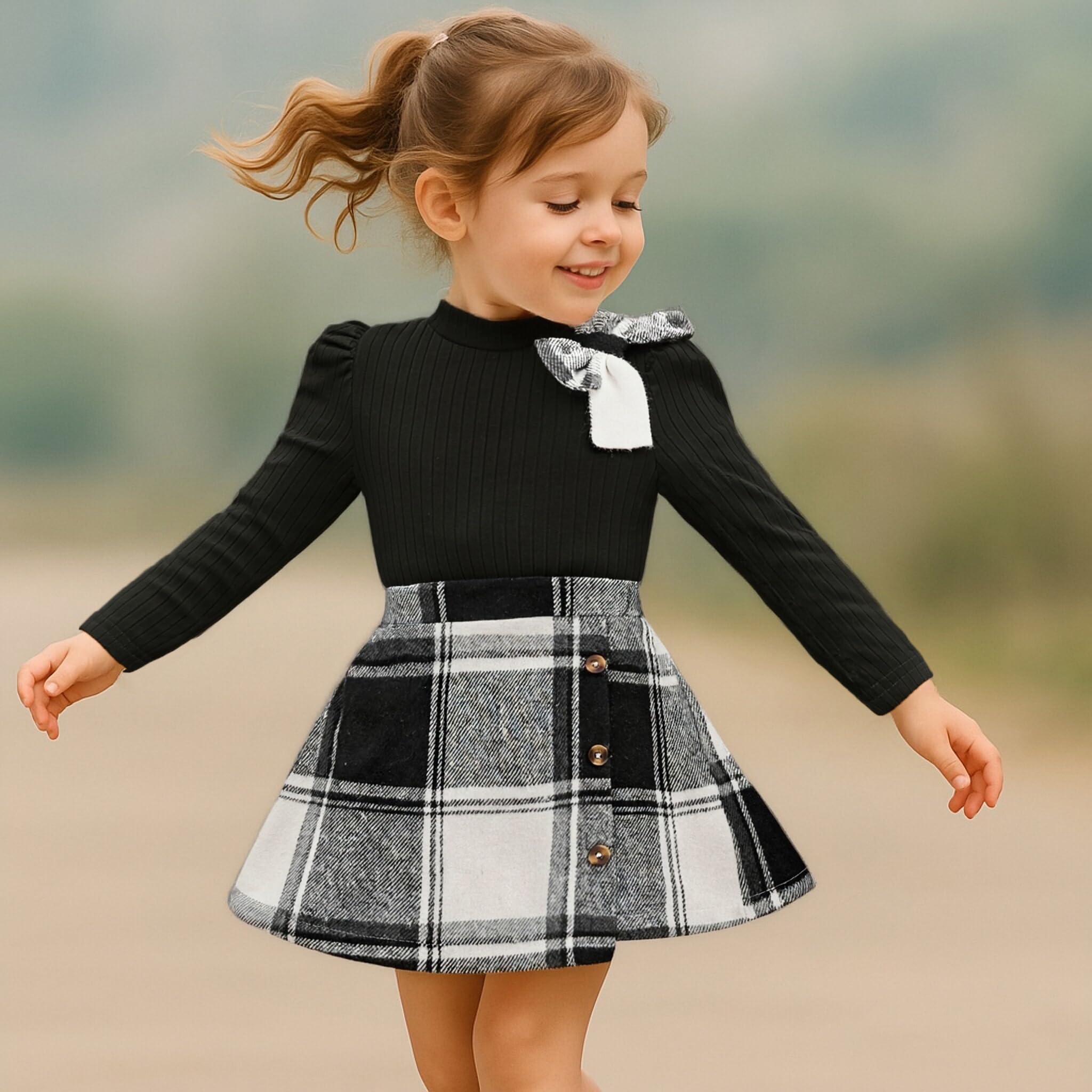 Design: Kids Little girl spring fall winter skirt set,knitted cotton long sleeve solid color top, button mini skirt with elastic waist , winter fashion warm toddler girls clothes outfits.