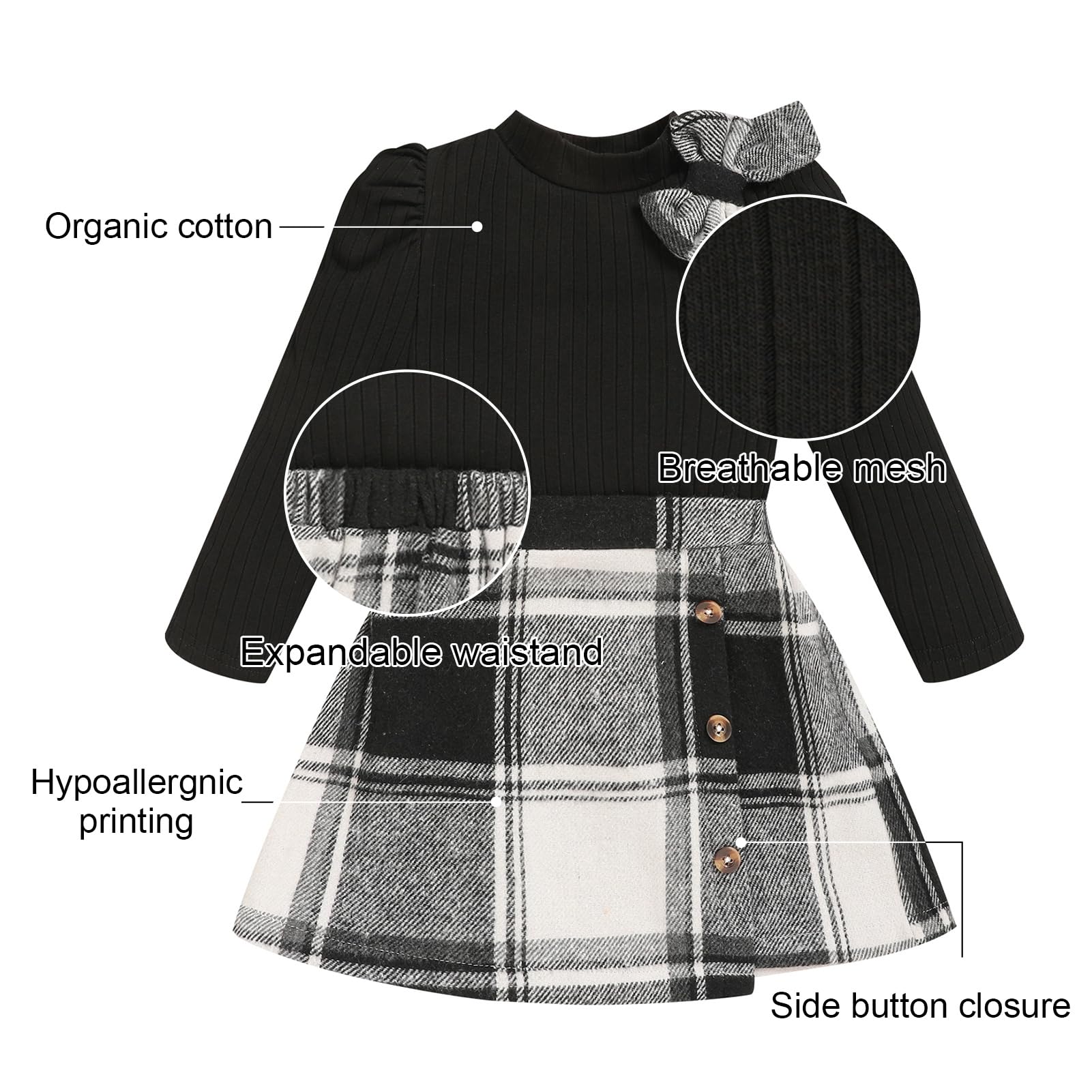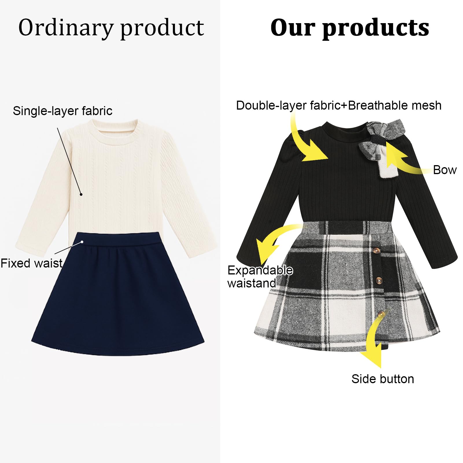 MATERIAL: Toddler girl shirt sweater top is made of cotton and polyester, bottom skirt is made of cotton blend and polyester, soft, breathble, and comfortable, sweet toddler baby girl 2 piece skirt set, cute baby girl clothes.
