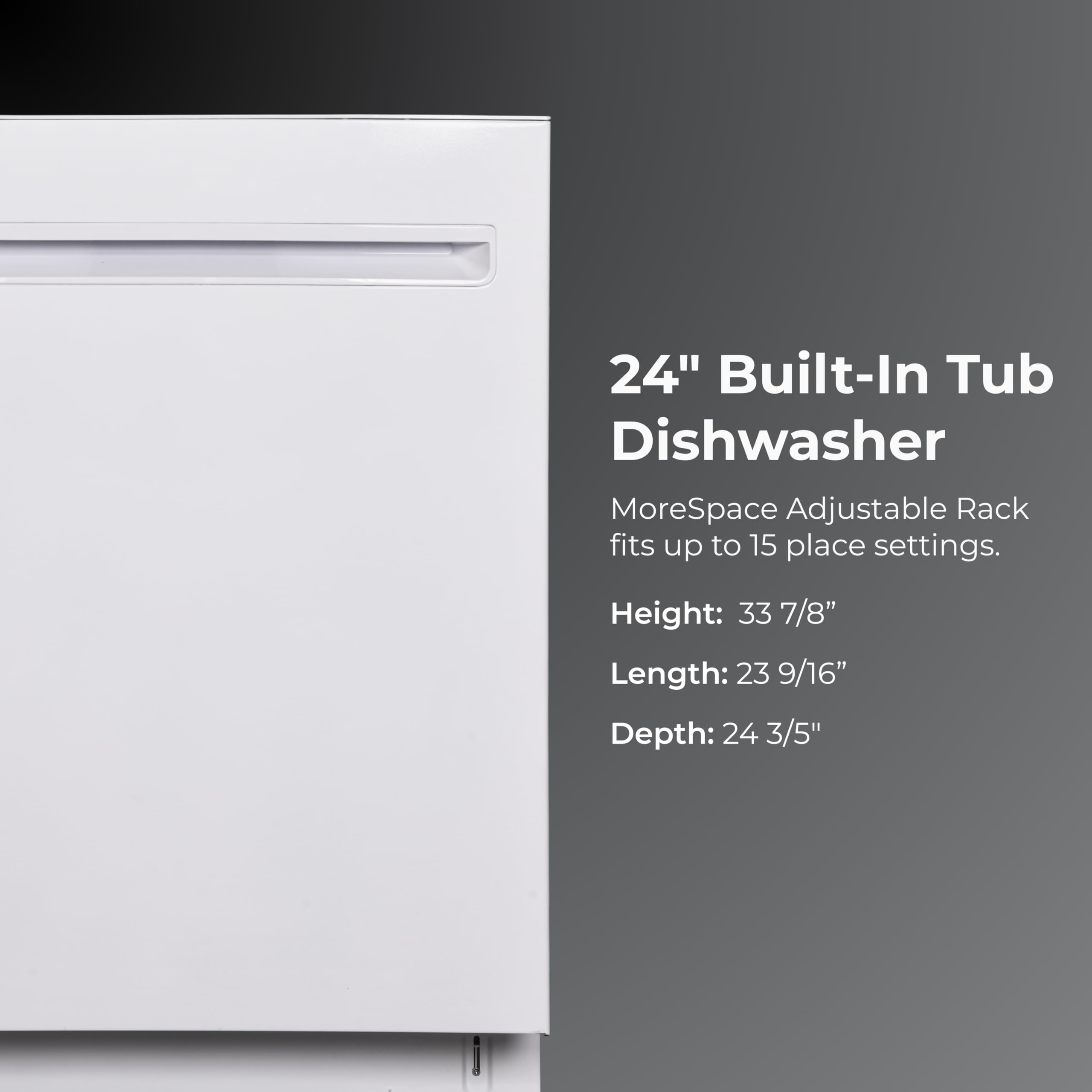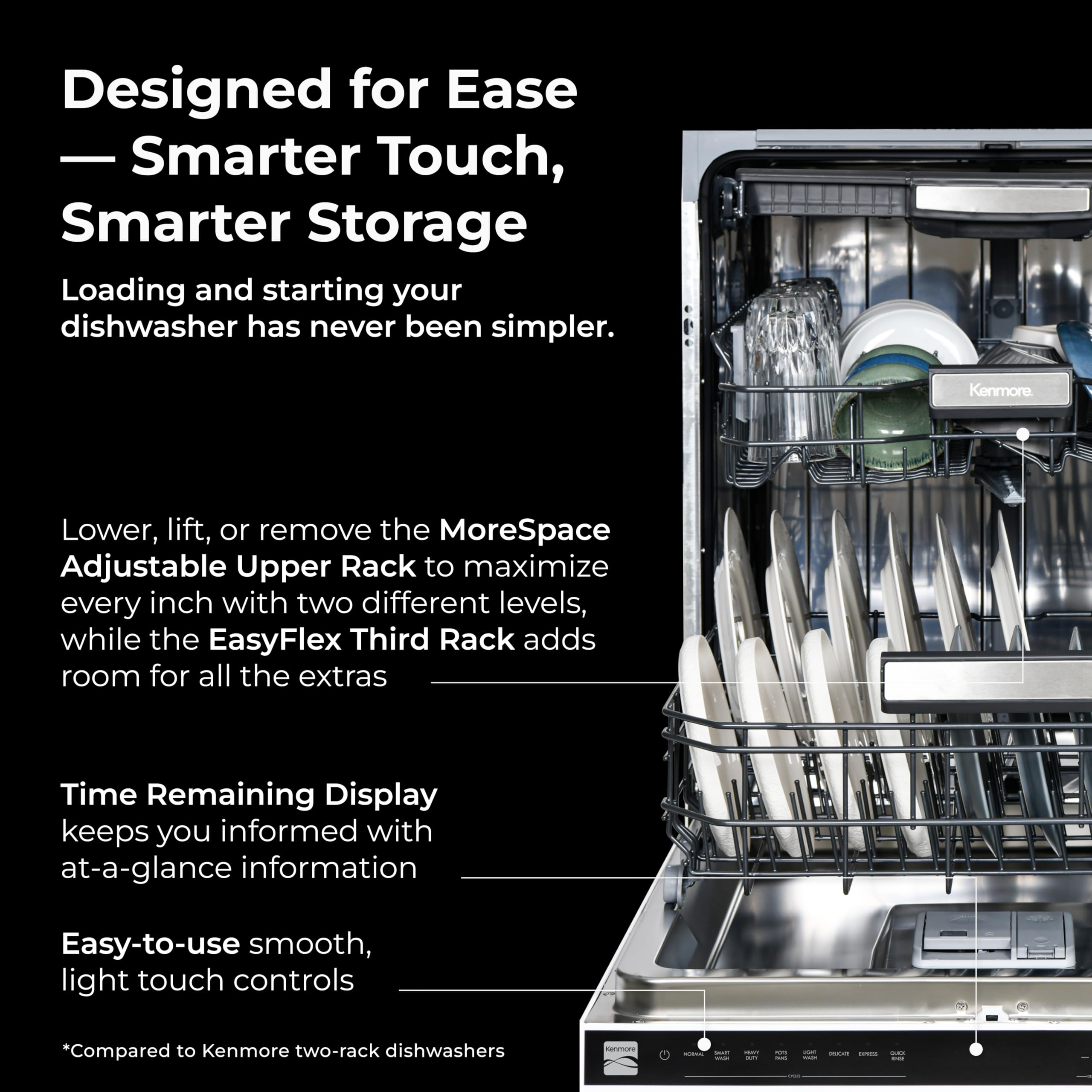 The Kenmore 24" Built-In Dishwasher gives you a powerful clean with an ultra-quiet performance. UltraWash Plus blasts away stuck-on messes with 3 pressurized spray arms and filtered water. The SmartWash cycle adjusts to the mess level, while TurboDry ensures spot-free dishes, even plastics. The EasyFlex Third Rack adds 35% more space for large utensils, and the MoreSpace Adjustable Rack makes room for tall or bulky items. With room for 15 place settings, you can handle big meals with ease. At just 45 dBA, it’s whisper quiet, and an LED floor light shows when a cycle is running. Hidden smooth-touch controls keep the exterior clean and modern. ENERGY STAR Certified with built-in Leak Detection and Delay Start for flexible, worry-free dishwashing.
