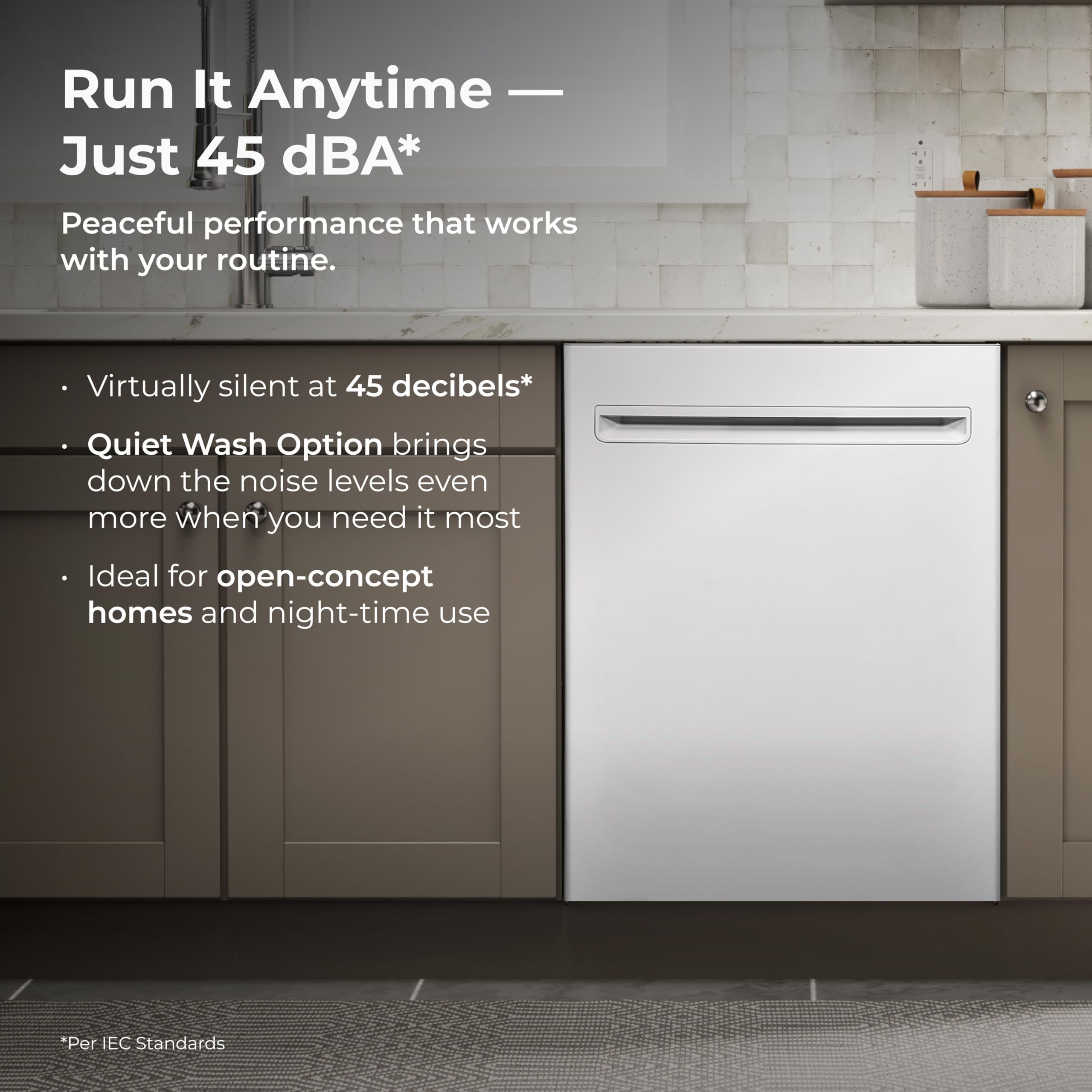 Whisper-Quiet Wash + Smart Features: This dishwasher runs at just 45 dBA, with a QuietWash option for a whisper quiet cycle. LED floor light shows when it's running, and smooth top-mounted controls add a modern, streamlined touch