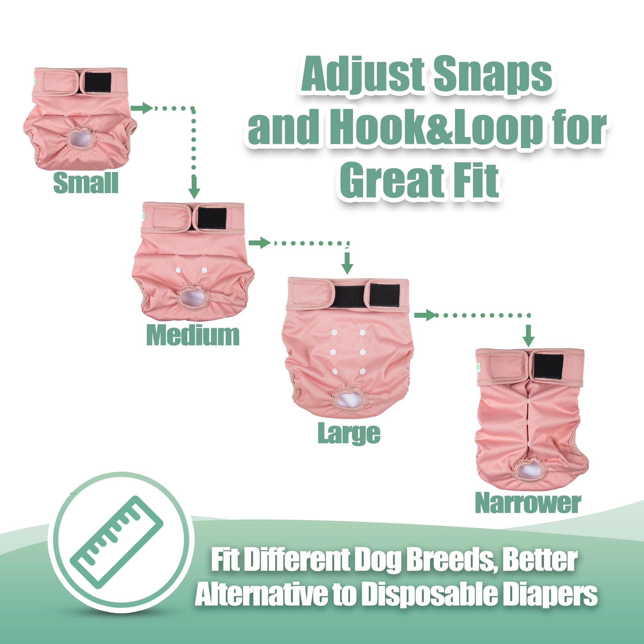 Washable dog diapers- Soft & Comfortable Diapers for Dogs - To increase your dog's comfort and acceptance our diaper wraps have no "crinkly" or uncomfortable texture that causes many dogs to dislike the ordinary disposable diapers. Hook & loop closures are quick and easy to put on and won't stick to your pet's fur.