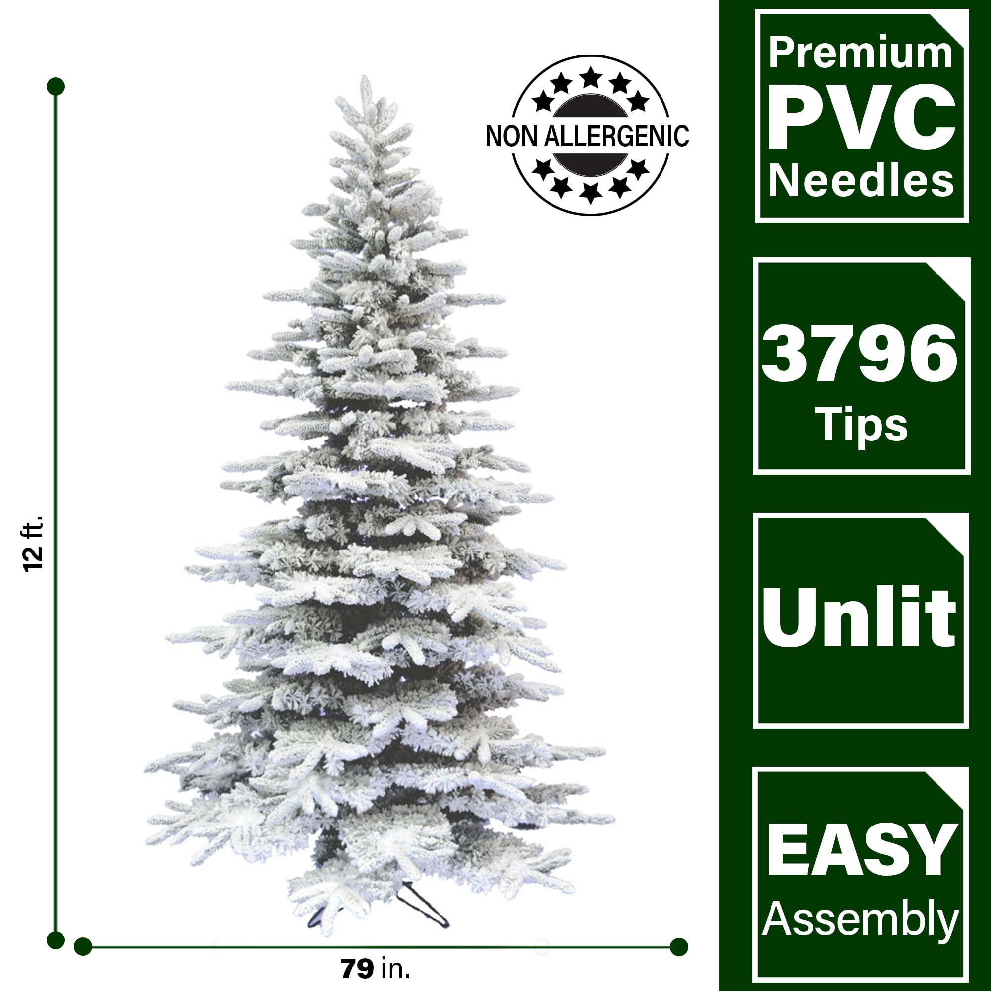 12-foot Tall: Standing 12-foot tall with a 79-inch diameter, this beautiful, snow covered, realistic christmas tree will make a statement in grand entryways with cathedral ceilings, making this tree the focal point of your home