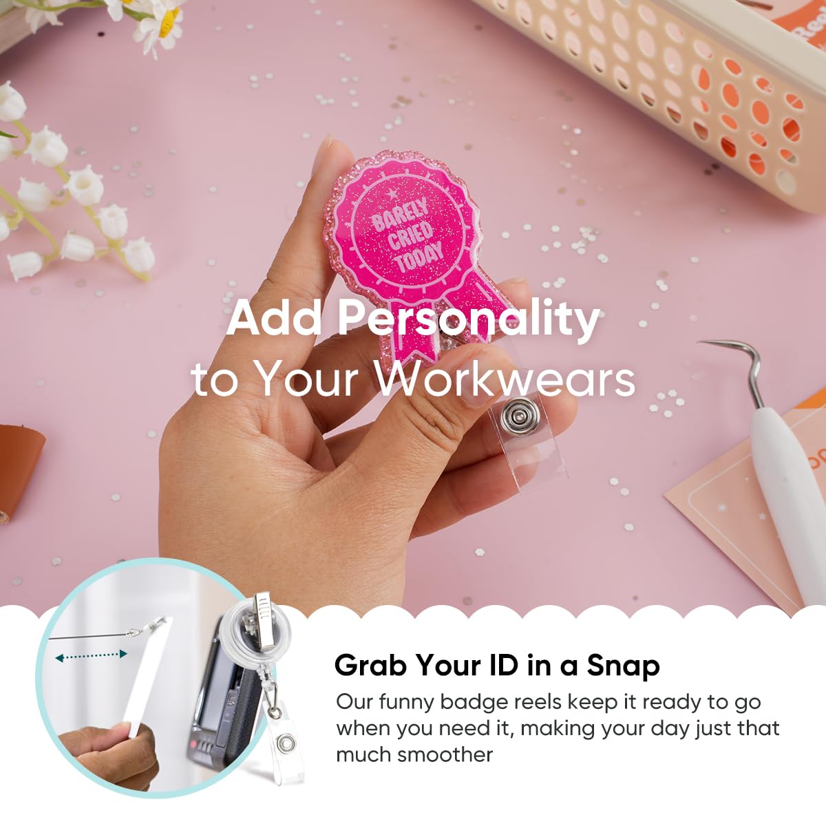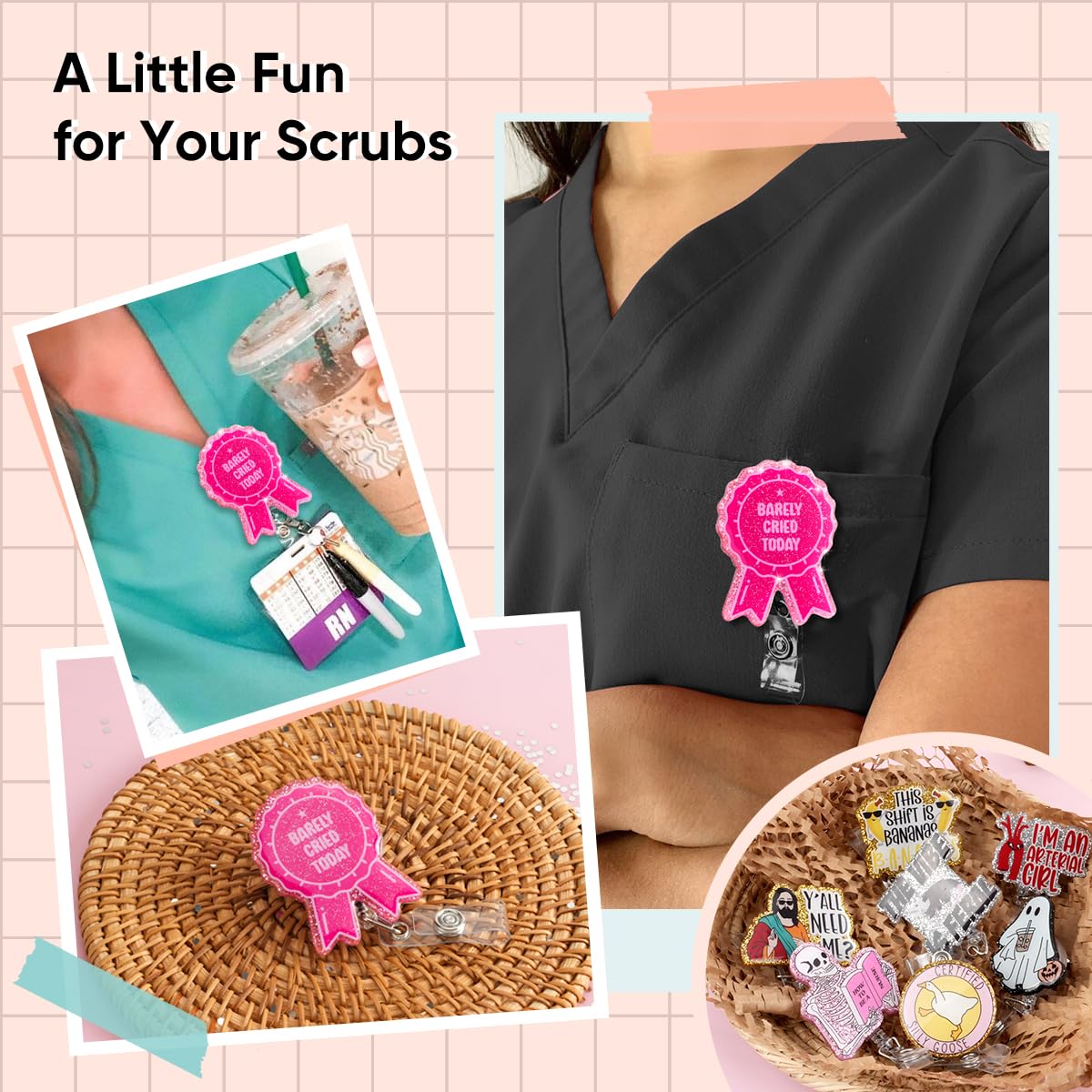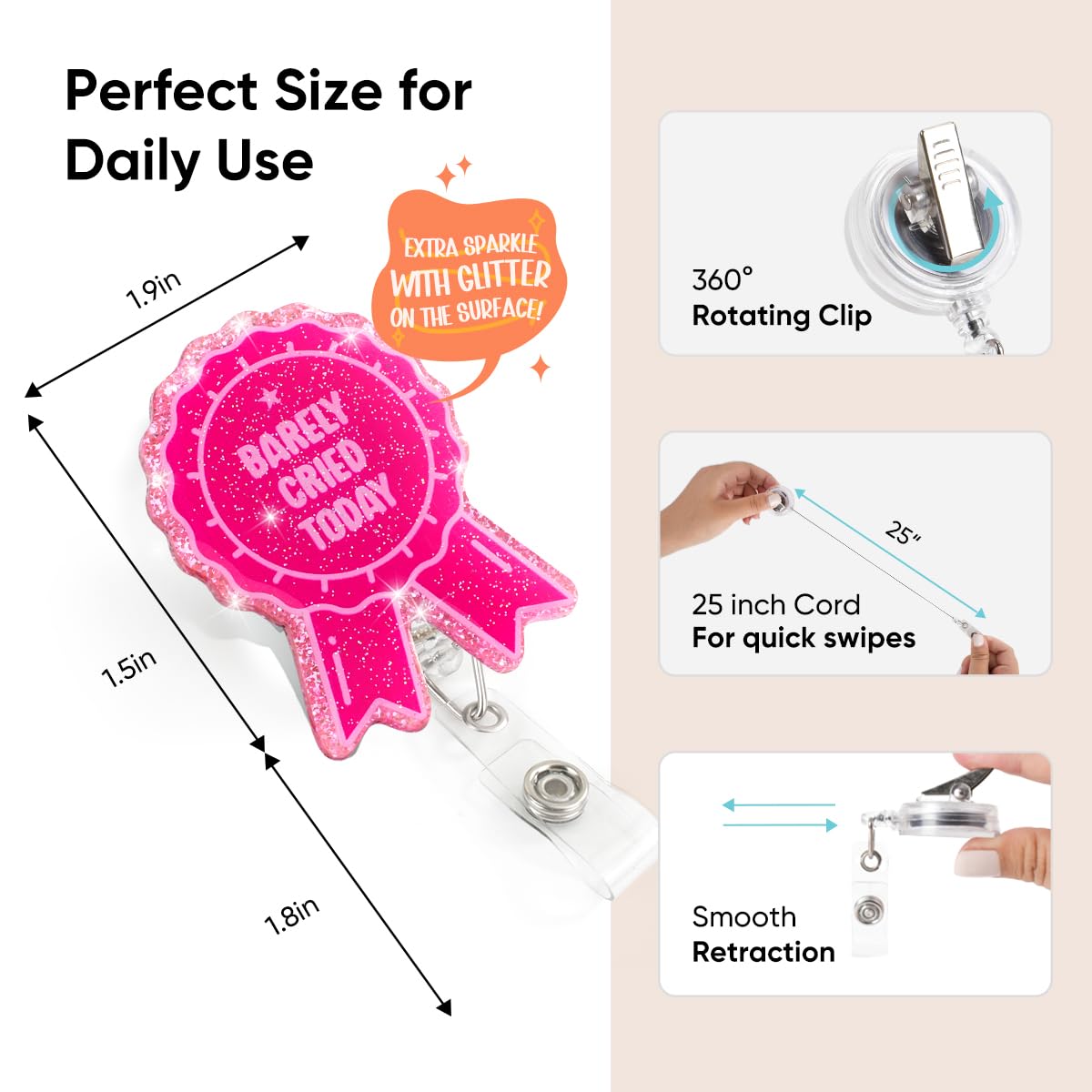 Barely Cried Today Badge Reel, Pink Ribbon Badge Reel, Funny Sassy Badge Reel, Interchangeable ID Retractable Badge Reel for Nurses RN EN Doctor Paramedic Teachers Medical Office Womens Man