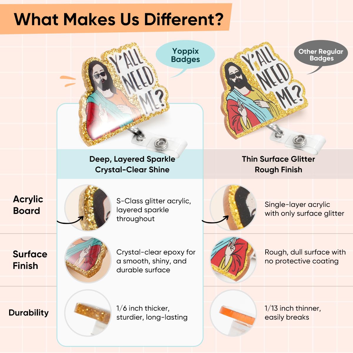 Retractable badge reel made of acrylic, resin, glitter and metal. Alligator clip with 360 degree rotation and extends up to 25 inches.
