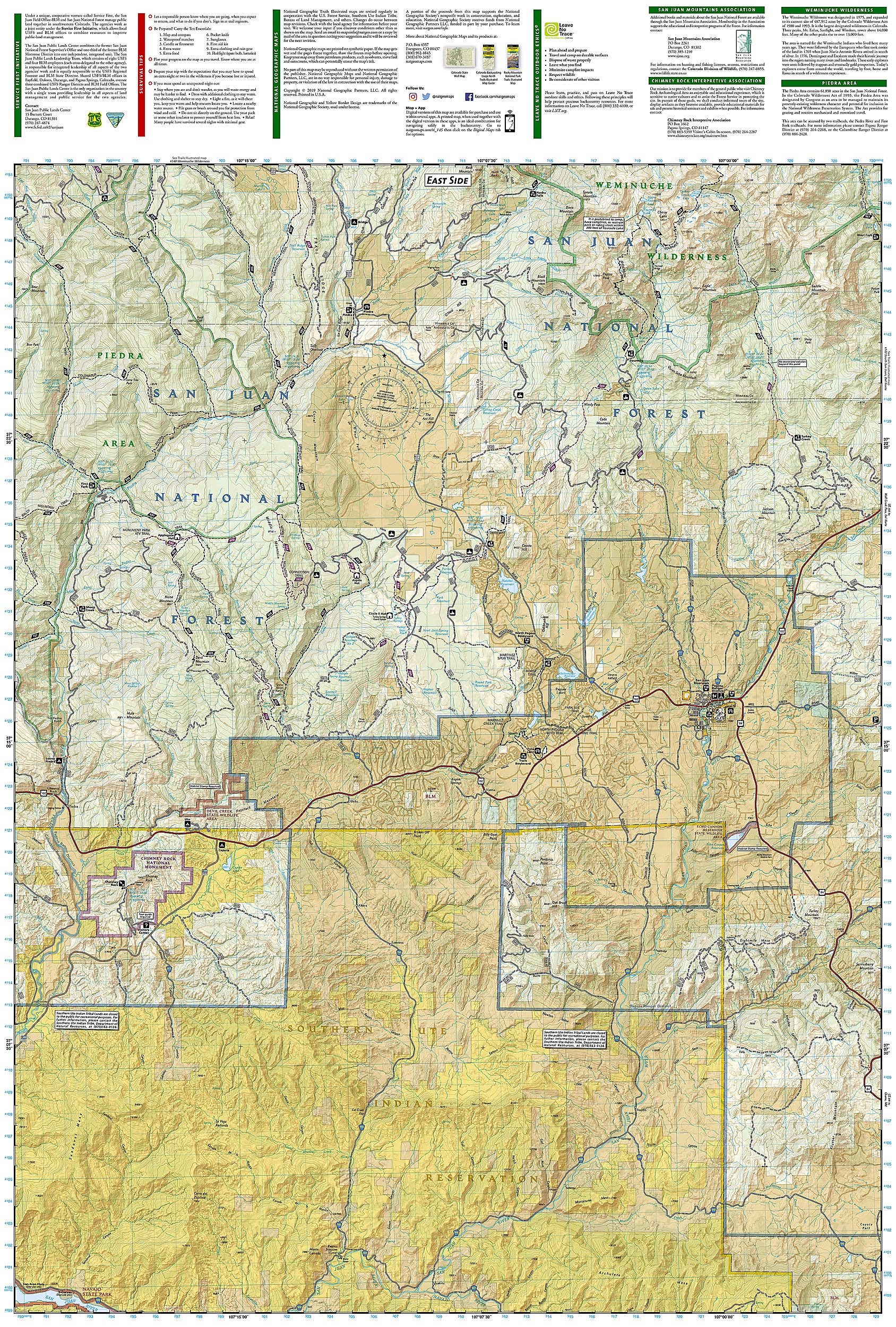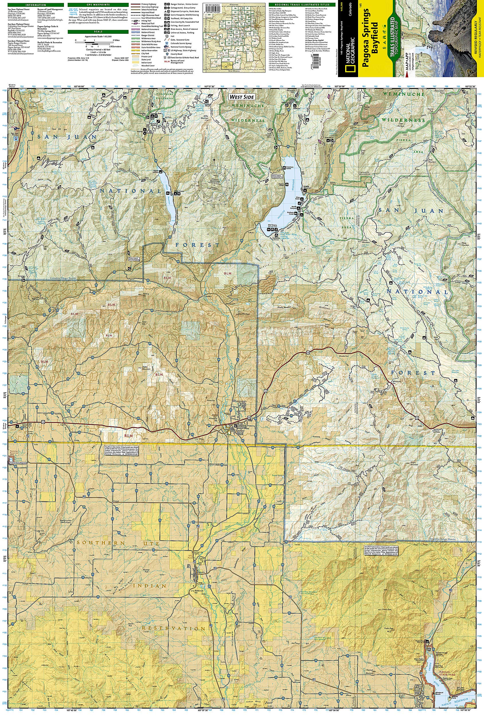 • Waterproof • Tear-Resistant • Topographic Map National Geographic's Trails Illustrated map of Pagosa Springs and Bayfield provides unparalleled detail of this area on the western slope of the Continental Divide in southwestern Colorado. Expertly researched and created in partnership with the U.S. Forest Service, Southern Ute Indian Tribe, Bureau of Land Management and others, the map's coverage includes San Juan National Forest, Piedra Area and River, Vallecito and Lemon Reservoirs, Chimney Rock National Monument and Southern Ute Indian Reservation. Get off the beaten path and back on again by following the map to trailheads and then along trails that are labeled according to their designated usage. High clearance and four-wheel drive roads are marked as well. To aid in your navigation, the map includes contour lines, elevations, labeled peaks, water features, waypoints, and clear boundaries between national park and Indian land, which is closed to the public for recreational purposes. Many recreation points of interest, for all seasons, are clearly noted, including campgrounds and campsites, cross-country ski areas and snowmobile trails, boat launch and river access points, fishing areas, scenic viewpoints and wildlife viewing areas. In addition, the map provides background information of the area, survival tips and contact information of both public and private organizations involved in maintaining the region. Every Trails Illustrated map is printed on "Backcountry Tough" waterproof, tear-resistant paper. A full UTM grid is printed on the map to aid with GPS navigation. Other features found on this map include: Mesa Mountains, Navajo River, San Juan National Forest, Vallecito Reservoir, Weminuche Wilderness. Map Scale = 1:63,360 Sheet Size = 25.5" x 37.75" Folded Size = 4" x 7.5"