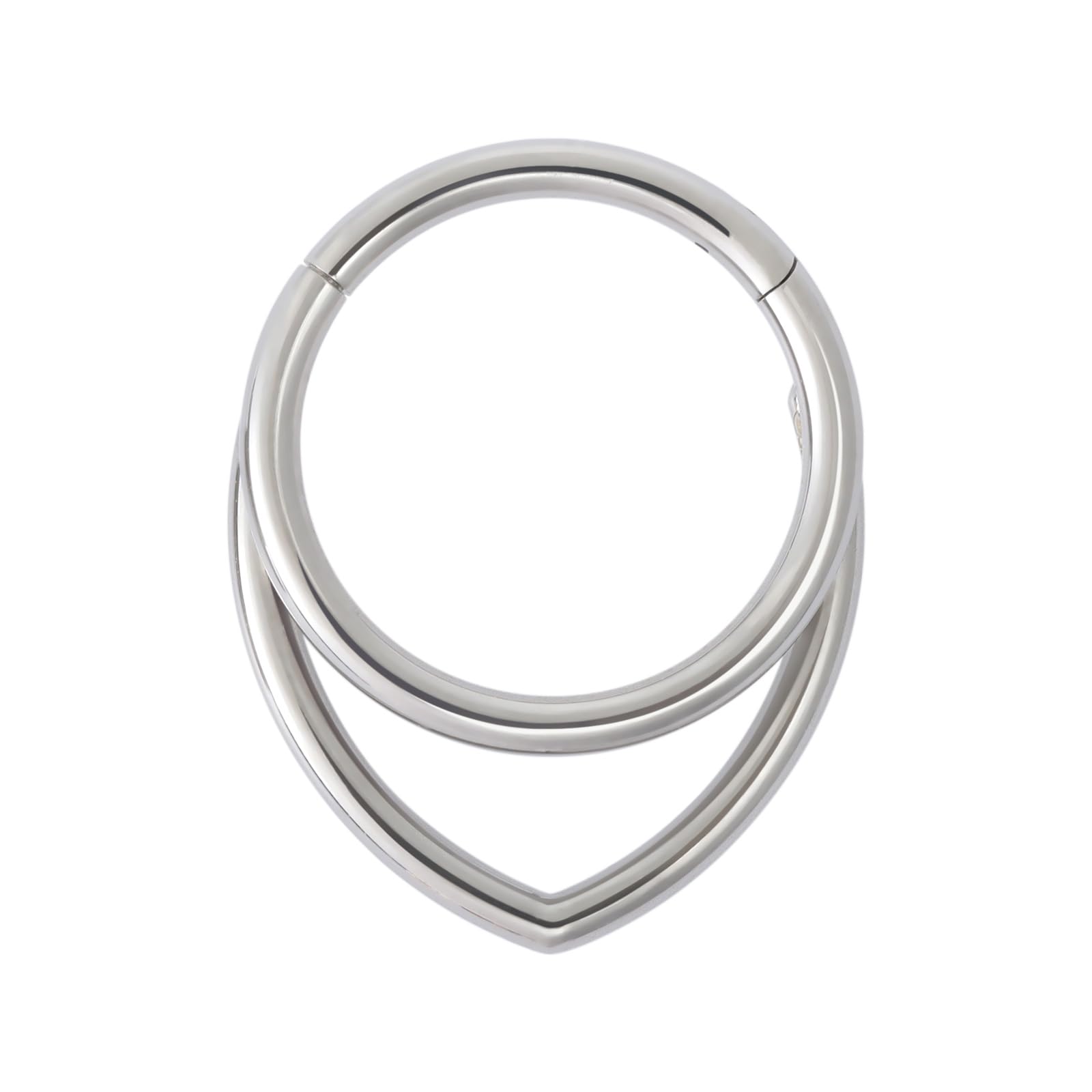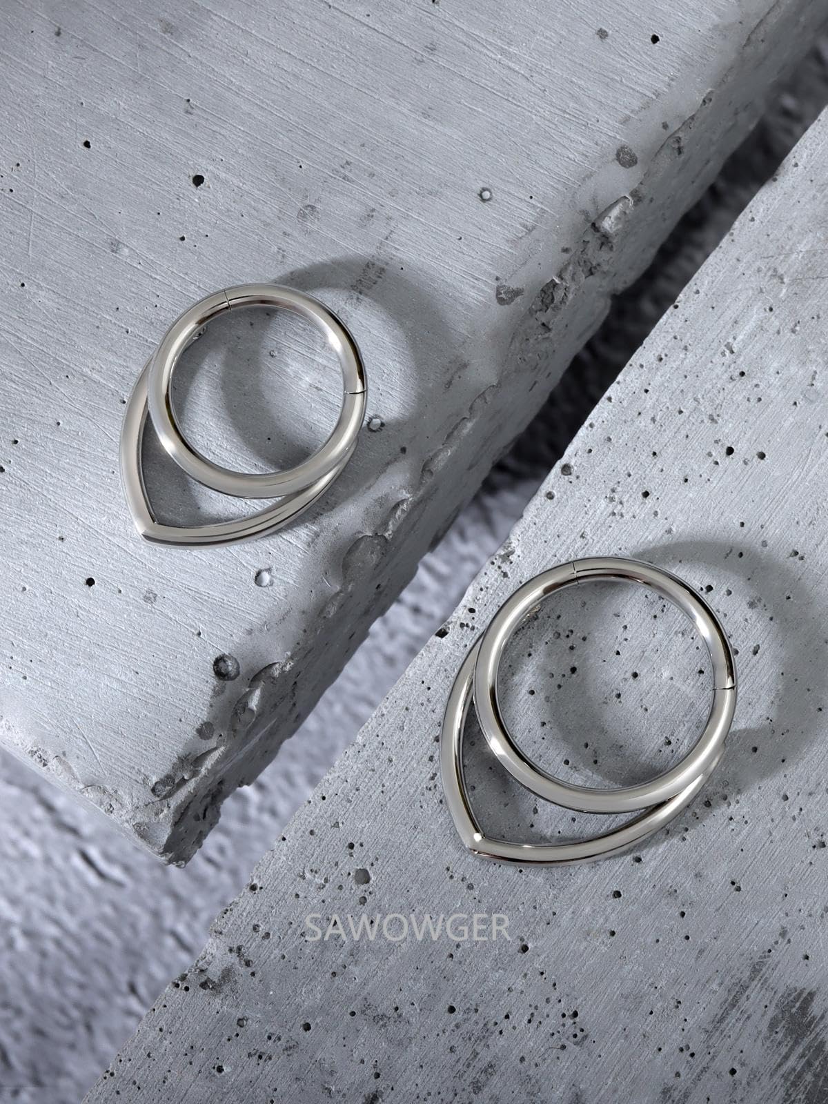 Design Concept: This septum jewelry combines circular and V-shape elements to create a double-layered effect with just one piercing. The circular part ensures maximum comfort, while the V-shape accentuates and elongates the nose for a more defined, sculpted appearance.