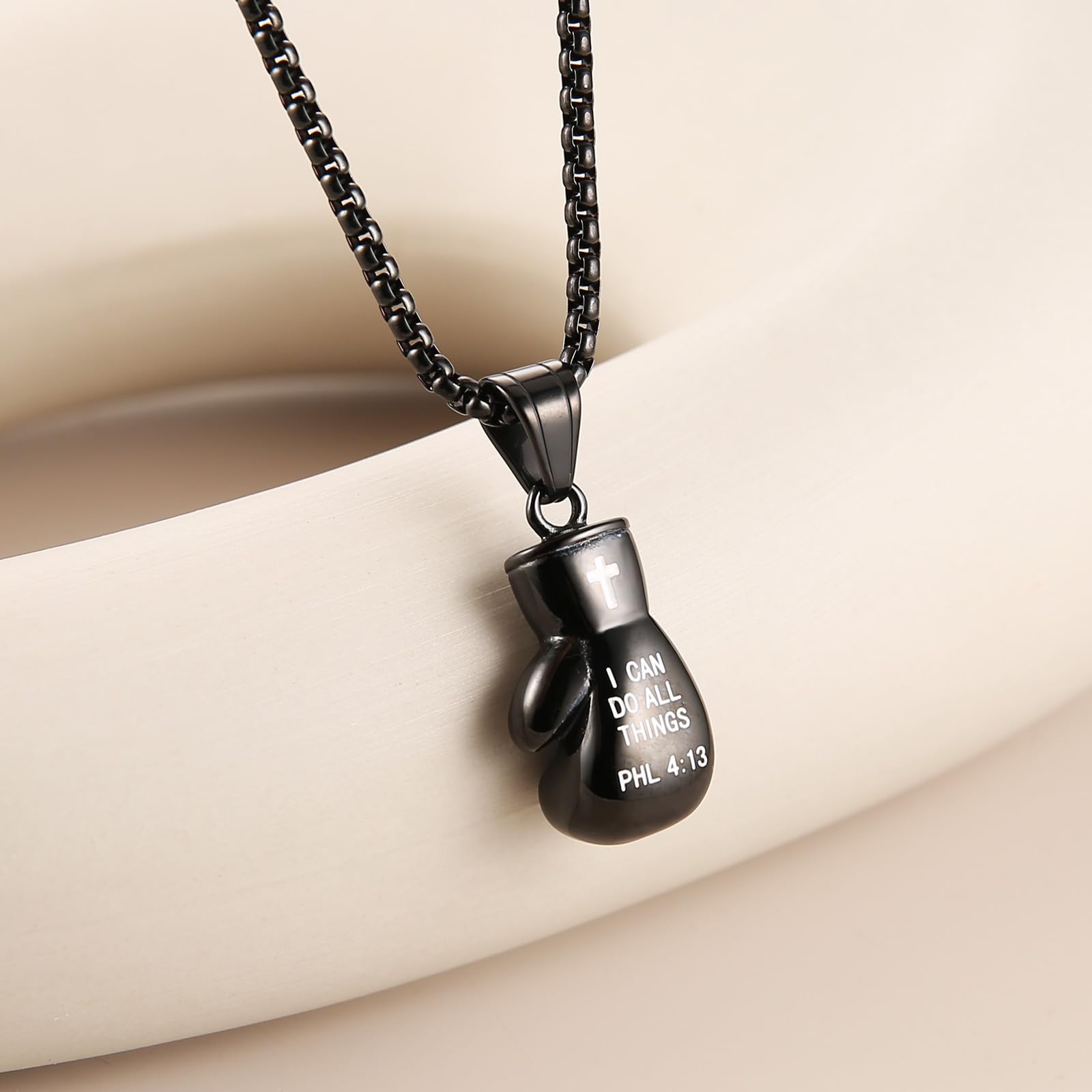 Boxing Glove Necklace: Featuring boxing gloves and scripture designs, this pendant symbolizes strength, determination and is a powerful statement, especially for those who love sports and boxing