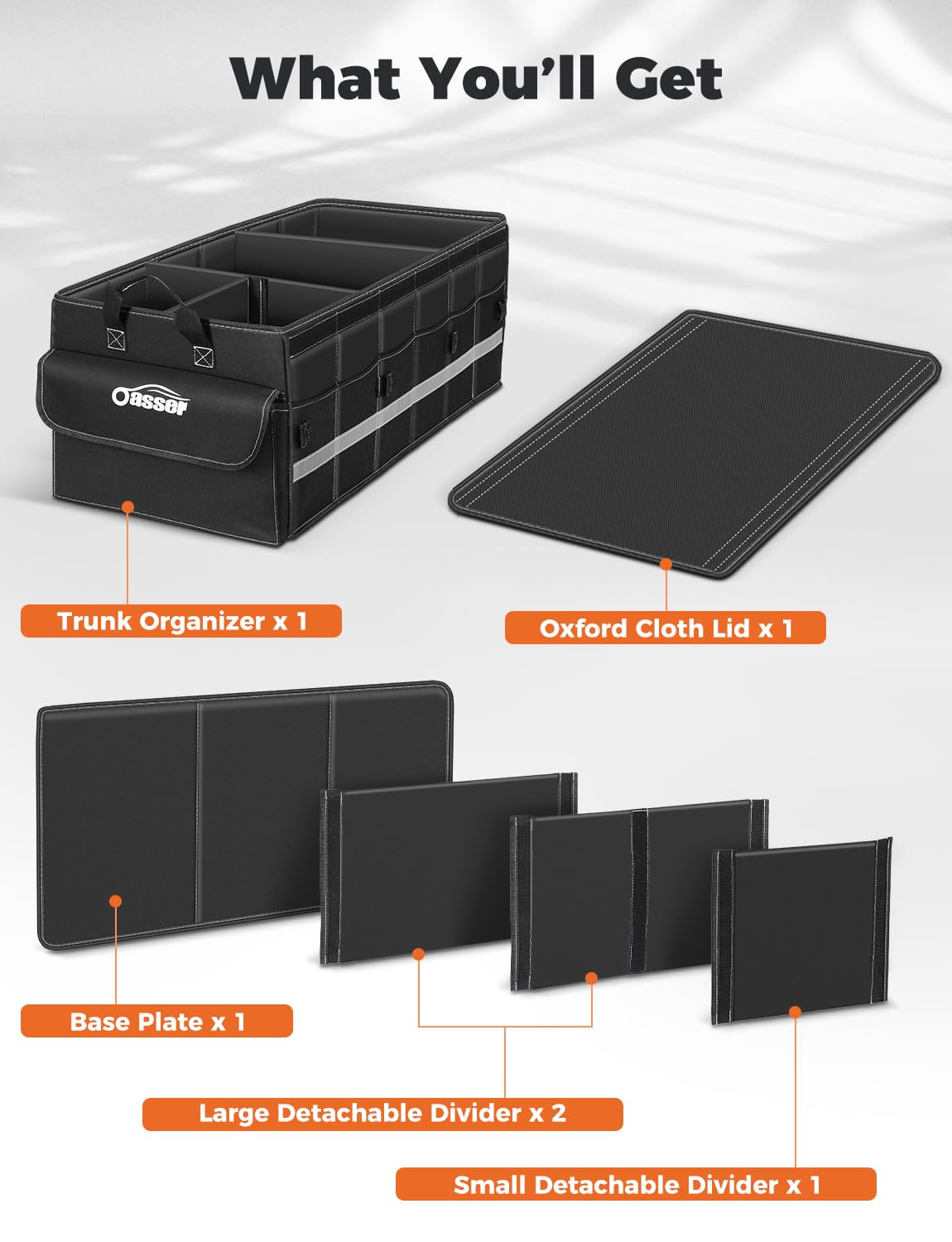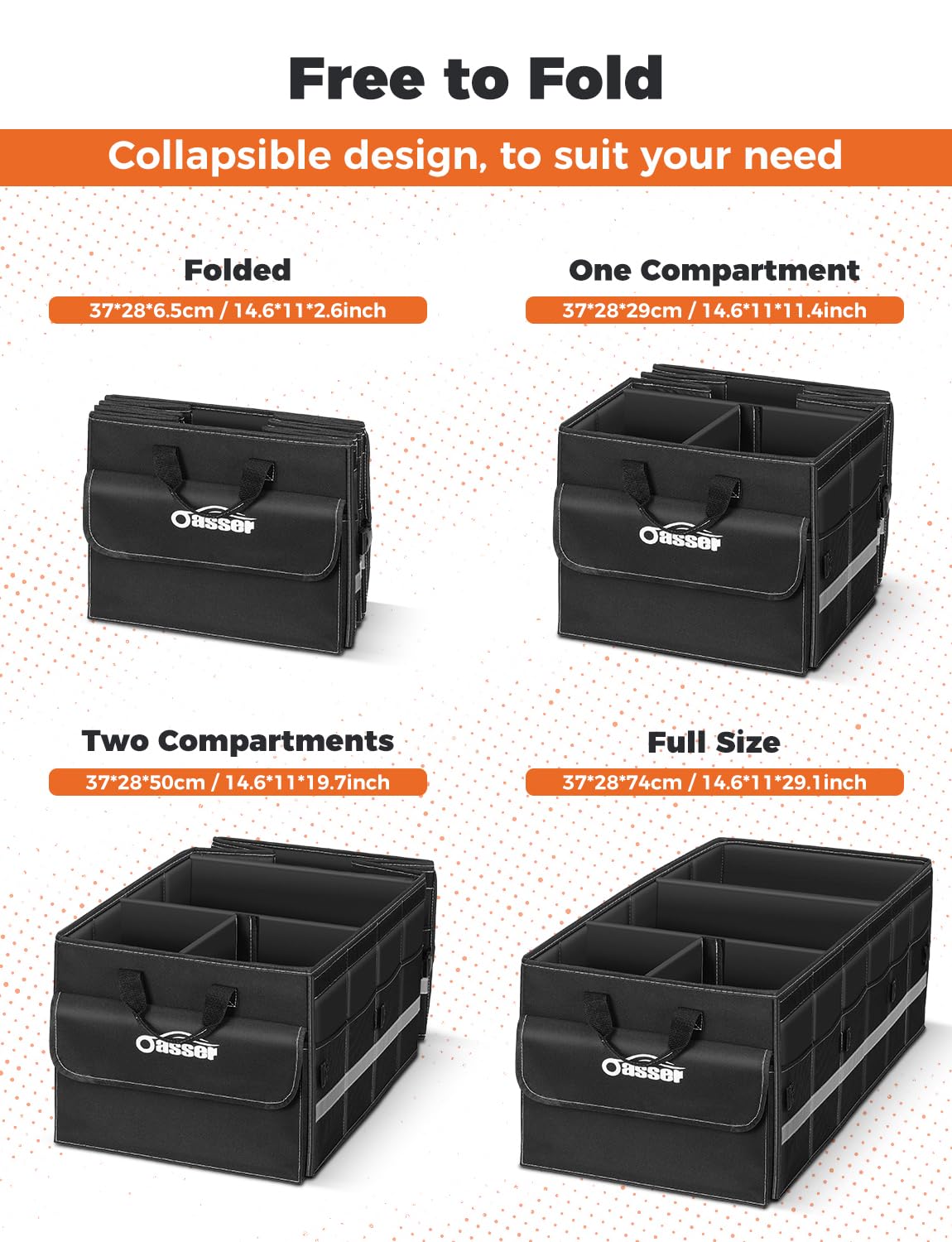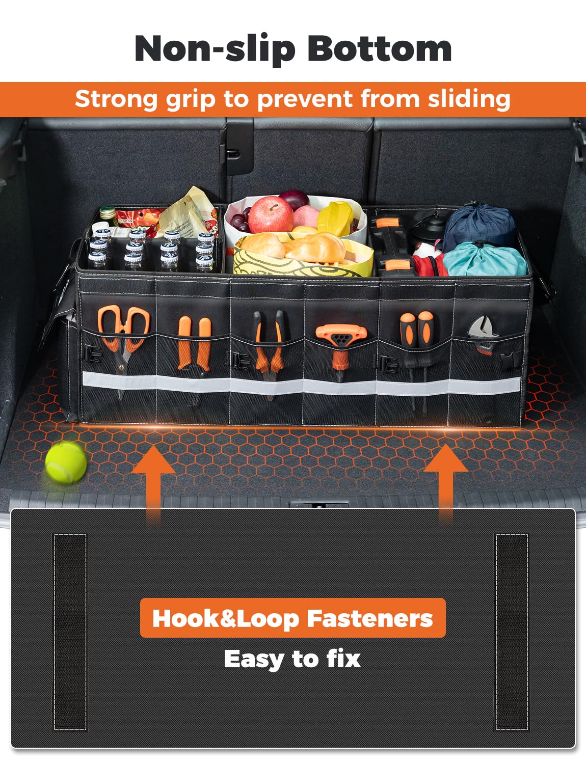 Non-slip Bottom: The bottom has two Hook&Loop Fastener to prevent the Oasser suv trunk organizer from moving while driving