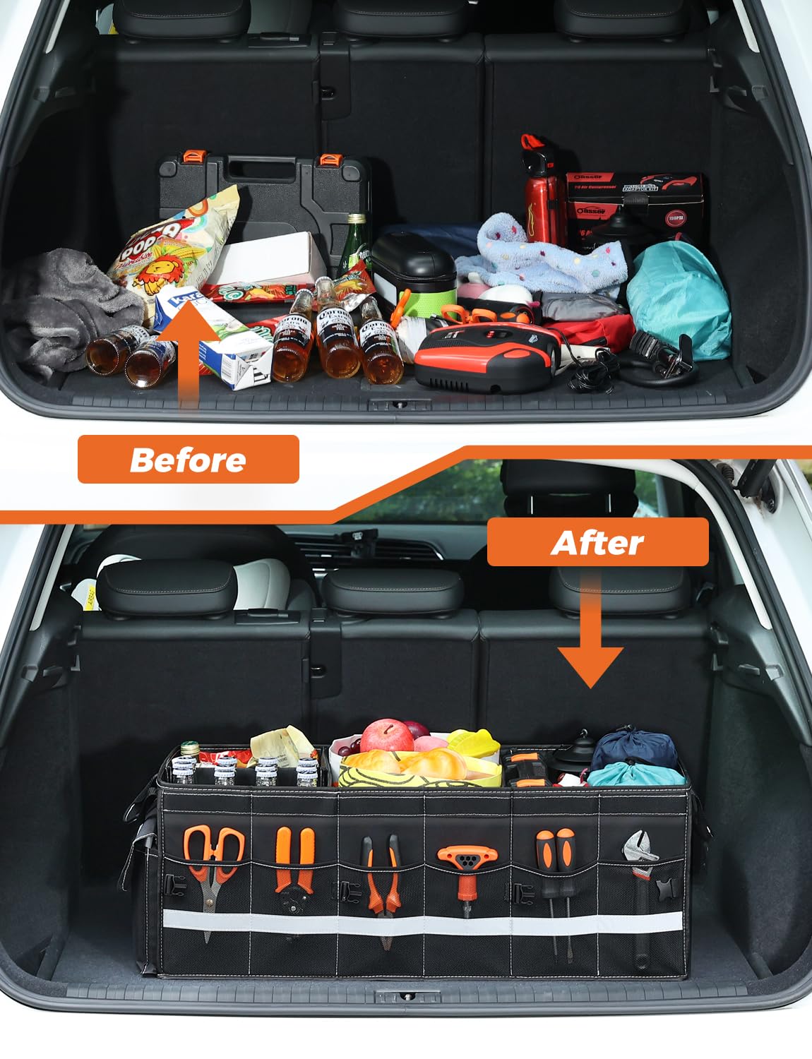 Collapsible: The trunk organizer can fold in snap with clips into a flat portable bag for easy carrying and storing; half-folded mode is ideal for the business or solo traveler by fitting in the passenger seat