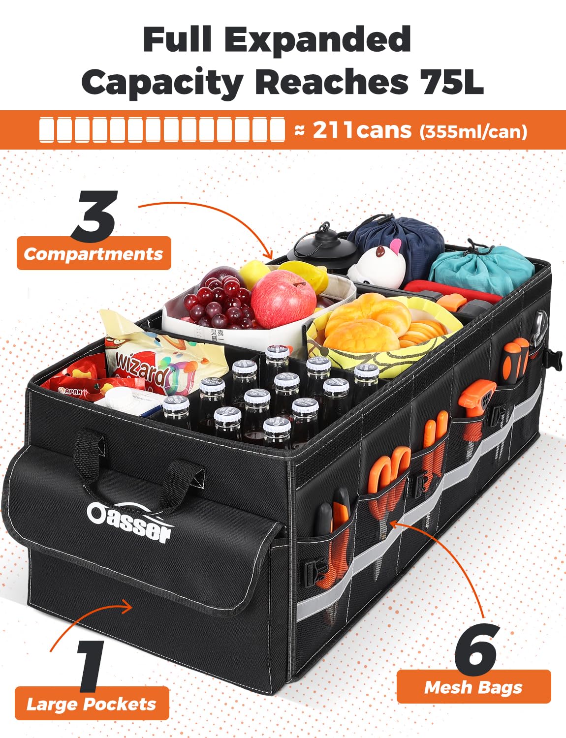 75L Capacity: the trunk organizer has 4 compartments to sort out your items; 3 removable sub-dividers allow different size compartment, 6 mesh pockets and a large side pocket give extra space for small items