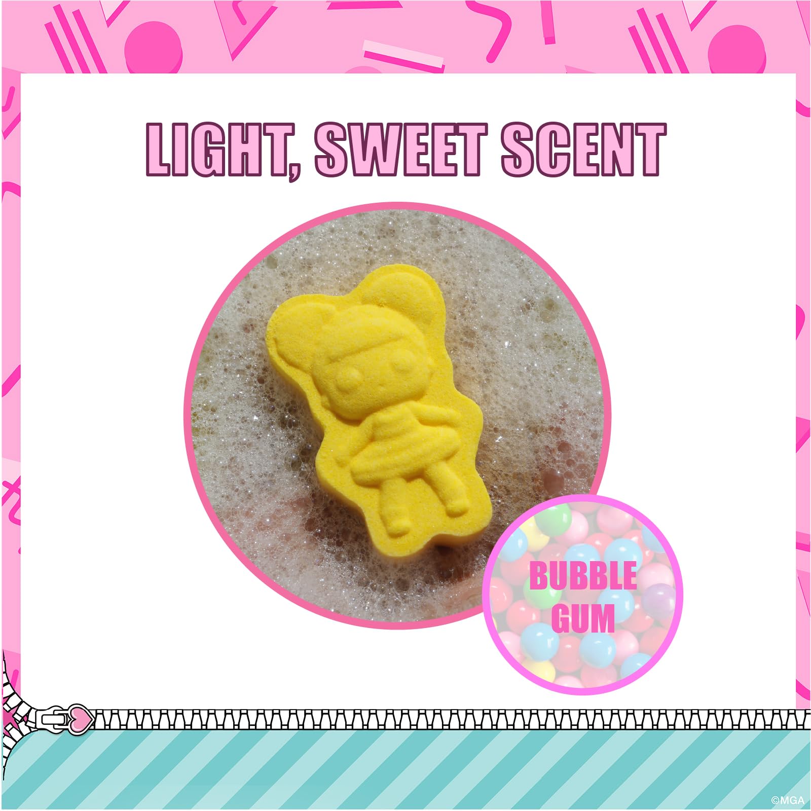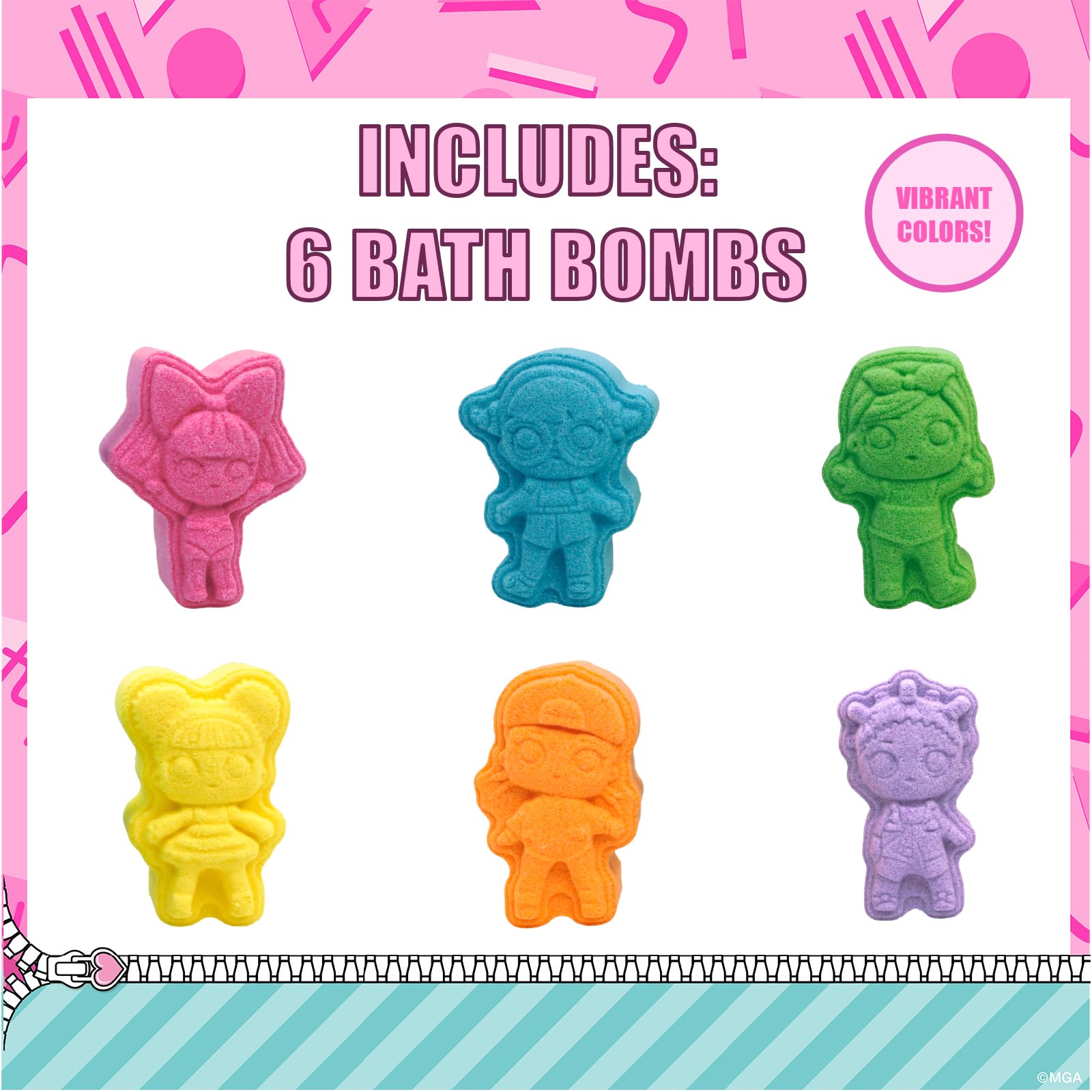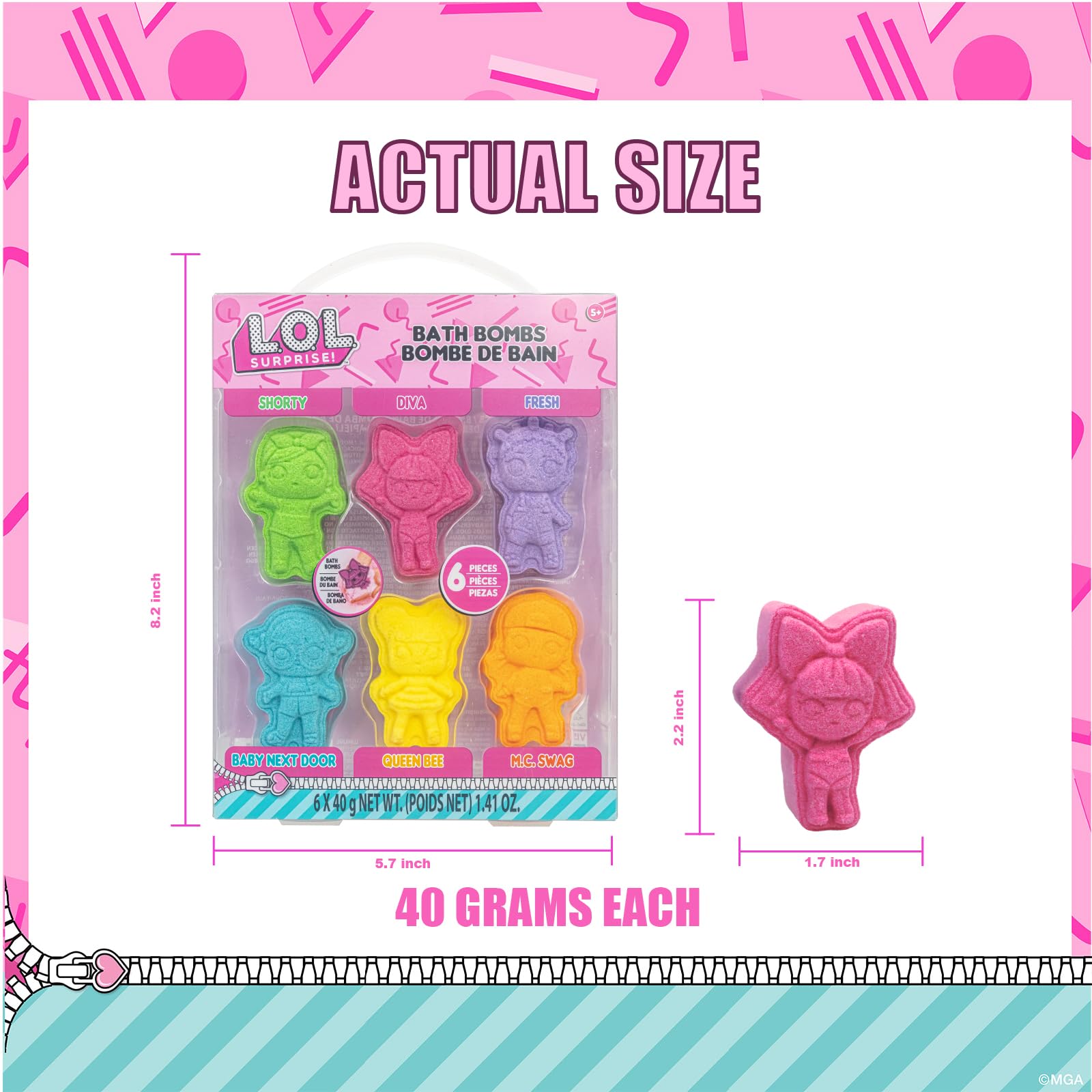SET INCLUDES: 6 40g bubble gum scented, molded bath bombs. Each bath bomb is molded into your favorite L.O.L. Surprise! Characters, such as Diva, Queen Bee, Fresh, M.C. Swag, and more!